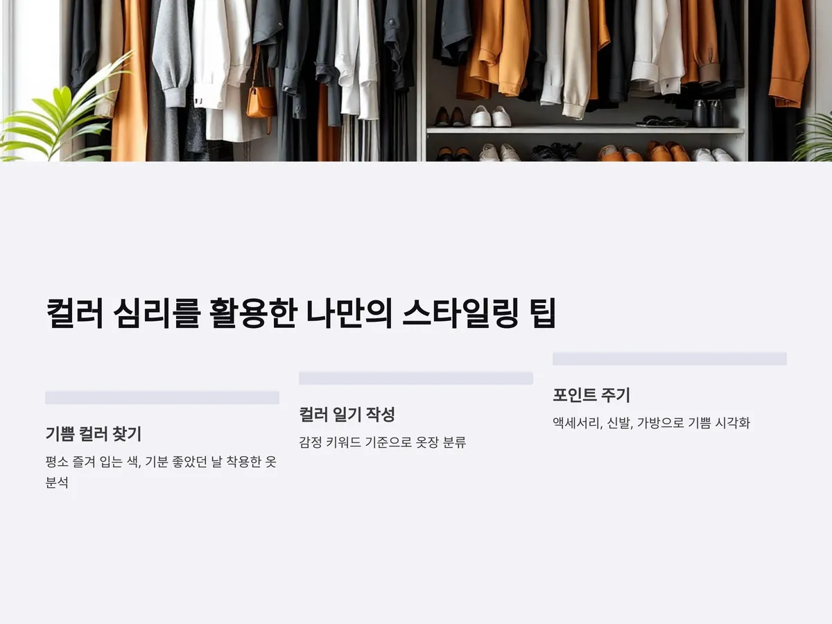기쁜 날을 더욱 특별하게 만드는 방법 중 하나는 '내 감정에 맞는 색을 선택하는 것'입니다. 자신만의 '기쁨 컬러'를 찾기 위해 평소 즐겨 입는 색과, 기분이 좋았던 날 착용한 옷을 되짚어보는 것이 도움이 됩니다. 컬러 일기를 써보는 것도 좋은 방법이며, 옷장 정리 시 감정 키워드를 기준으로 분류하면, 아침마다 더 빠르고 만족도 높은 스타일링이 가능합니다.