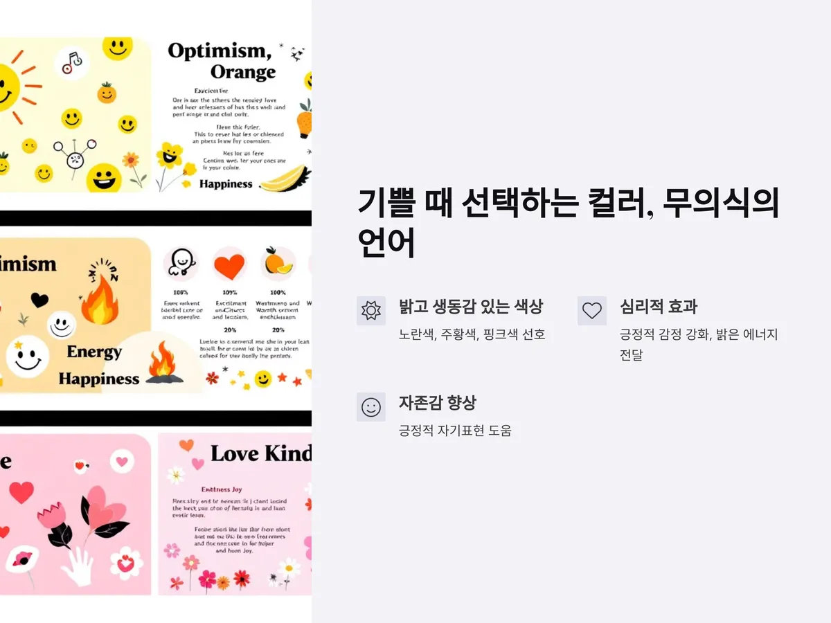 기쁨은 따뜻하고 긍정적인 감정이며, 자연스럽게 밝고 생동감 있는 색상과 연결됩니다. 많은 사람들은 기분이 좋을 때 노란색, 주황색, 핑크색처럼 활기차고 따뜻한 계열의 컬러를 찾습니다. 이러한 색상은 심리적으로도 긍정적인 감정을 강화시키는 효과가 있으며, 자신뿐 아니라 주변 사람에게도 밝은 에너지를 전달합니다.