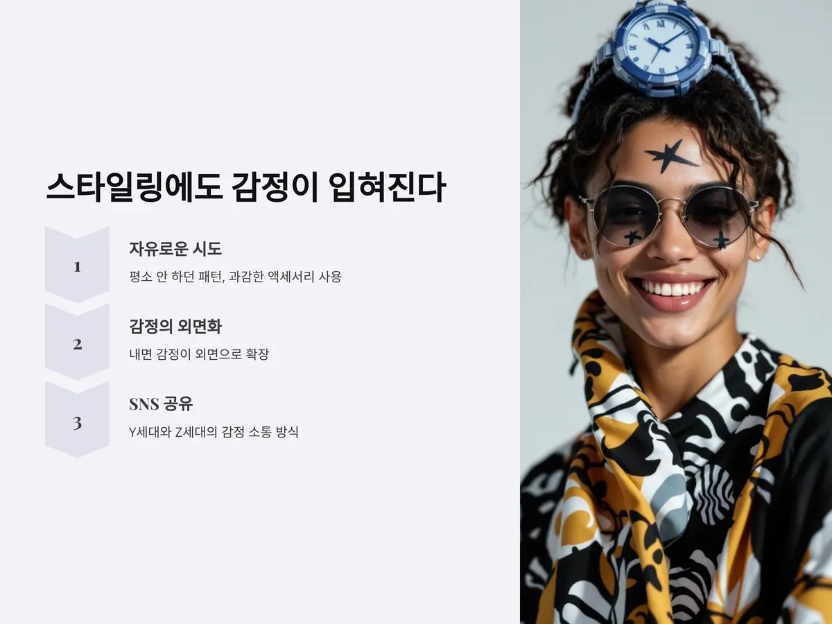 스타일링에서의 '기쁨 표현'은 많은 경우 즉흥적이고 감각적인 선택으로 나타나며, 이런 자유로운 시도가 패션의 다양성과 개인화된 트렌드를 만들어내는 동력이 됩니다. 특히 Y세대와 Z세대의 경우, 자신의 기분을 반영한 스타일링을 SNS에 공유하는 것이 일상이 되었고, 이는 또 다른 형태의 감정 소통 방식으로 주목받고 있습니다.