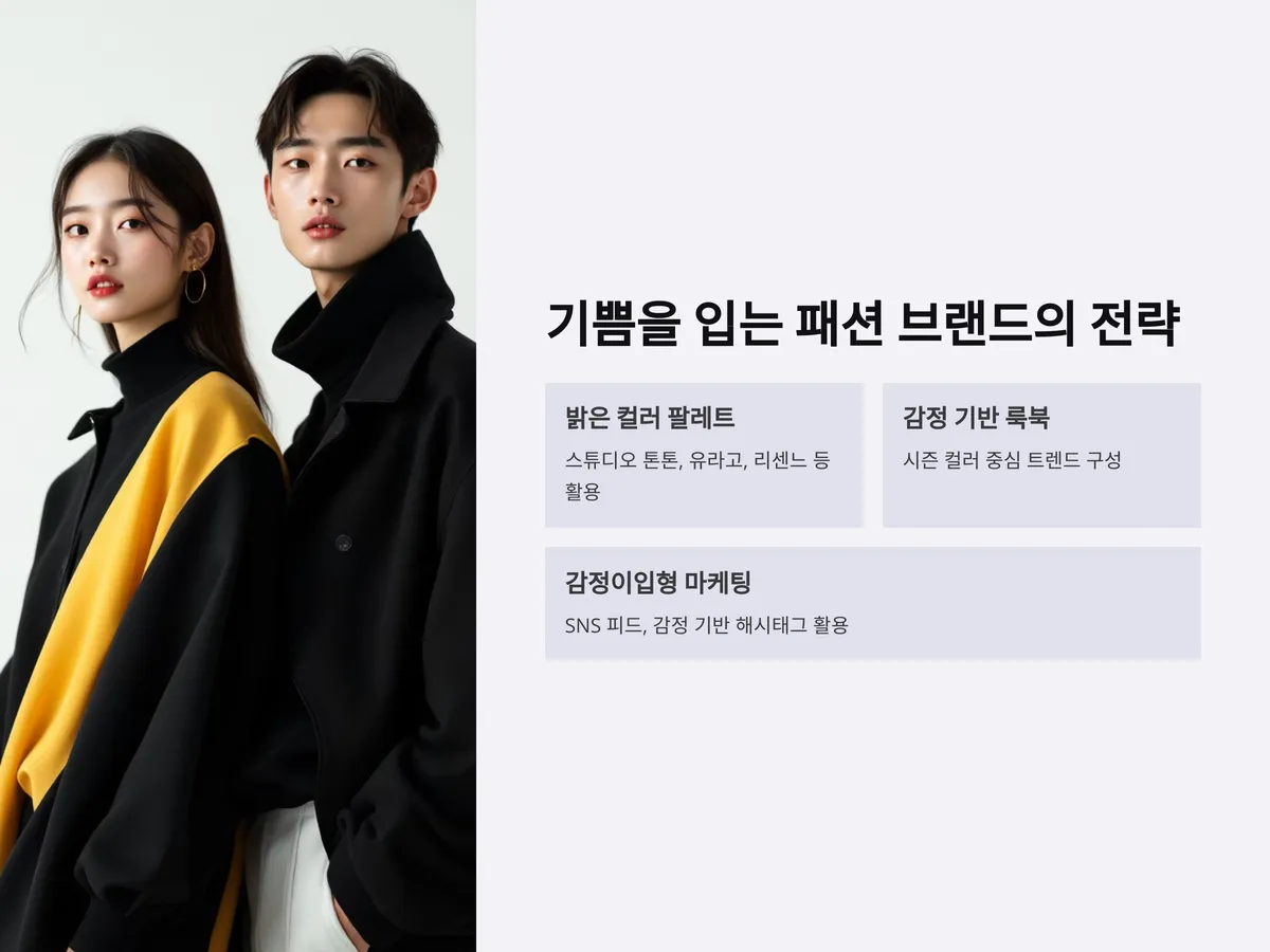 기쁠 때 입고 싶은 옷을 만드는 브랜드들도 이런 심리를 반영하고 있습니다. 예컨대 '스튜디오 톤톤', '유라고', '리센느' 같은 국내 브랜드들은 밝은 컬러 팔레트를 기반으로 한 컬렉션을 통해 소비자의 감정을 자극하는 전략을 취하고 있습니다. 시즌 컬러를 중심으로 트렌드에 따라 감정 기반의 룩북을 구성하고, 실제 착용자의 후기에서도 '기분이 좋아지는 옷'이라는 평가가 잦습니다.