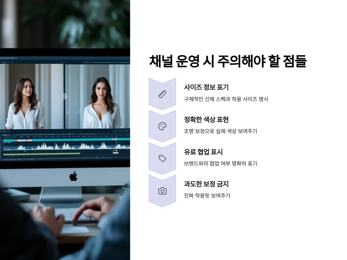 - 과도한 보정 및 리터칭 금지: 진짜 착용핏이 보이지 않으면 신뢰도가 떨어집니다.