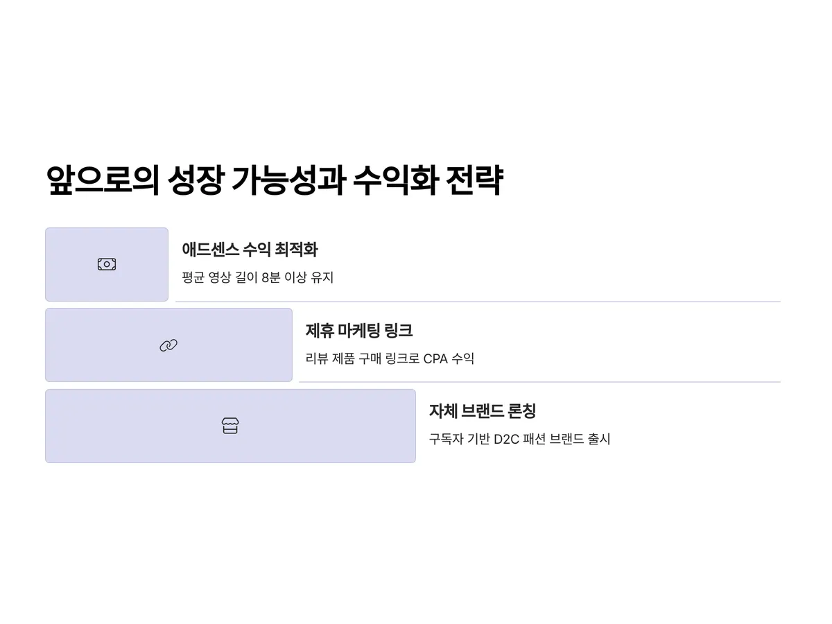 빅사이즈패션 유튜브 채널은 지금보다 훨씬 더 성장할 여지가 큽니다. 특히 AI 기반 쇼핑 큐레이션, 실시간 댓글 기반 맞춤 추천 등 기능이 추가되면 구독자 경험이 더욱 향상될 것입니다. 수익화 전략으로는 다음을 고려할 수 있습니다: