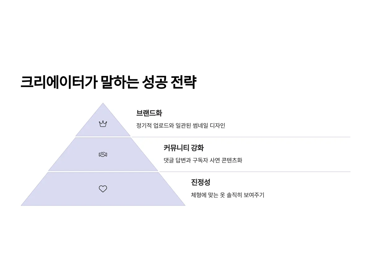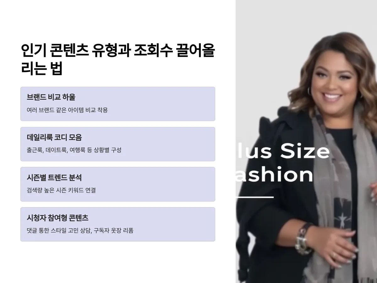 - 시청자 참여형 콘텐츠: 댓글을 통한 스타일 고민 상담, 구독자 옷장 리폼 등이 구독자의 몰입도를 높입니다.