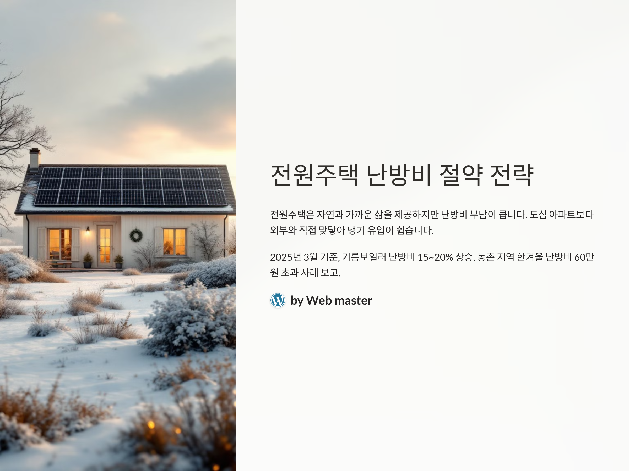2025년 3월 기준, 기름보일러 난방비는 평균 15~20% 상승했고, 농촌 지역의 경우 한겨울 한 달 난방비가 60만 원을 넘는 사례도 보고되고 있습니다. 이에 따라 주택 구조, 단열 방식, 난방 방식 등을 종합적으로 고려한 효율적 절약 전략이 절실한 시점입니다. 이 글에서는 난방비를 획기적으로 절감할 수 있는 실질적인 방법과 최신 트렌드를 반영한 전략을 소개합니다. 체류 시간을 늘릴 수 있도록 실사용자의 팁도 함께 공유하니, 전원주택에서의 에너지 절감과 더 나은 생활을 원하신다면 꼭 끝까지 읽어보세요.