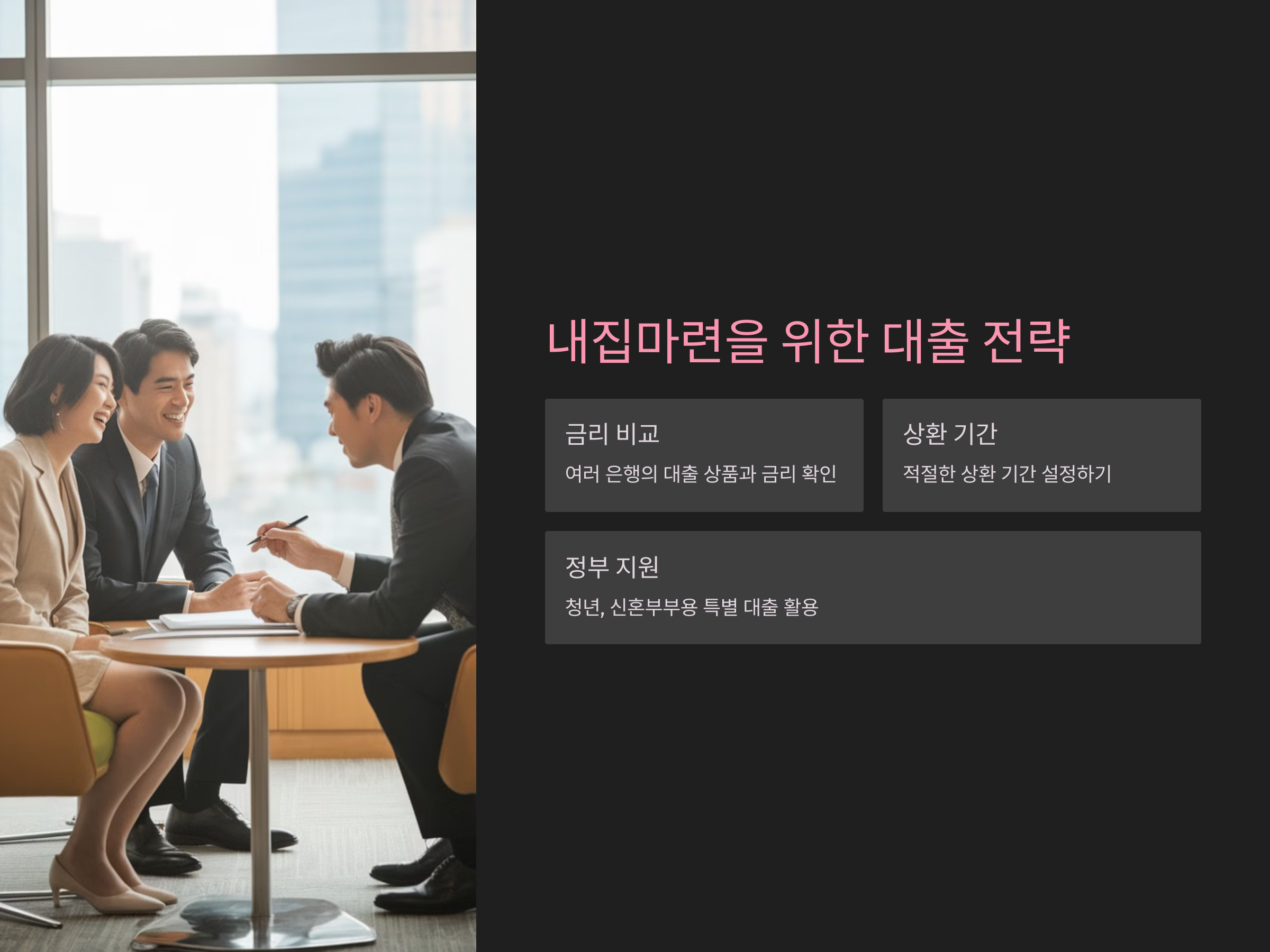 또한, 정부 지원 대출 상품을 활용하는 것도 좋은 전략입니다. 청년, 신혼부부, 다자녀 가구 등을 위한 특별 대출 상품들이 존재하므로, 이런 상품들을 잘 활용하는 것이 내집마련을 위한 좋은 방법이 될 수 있습니다.