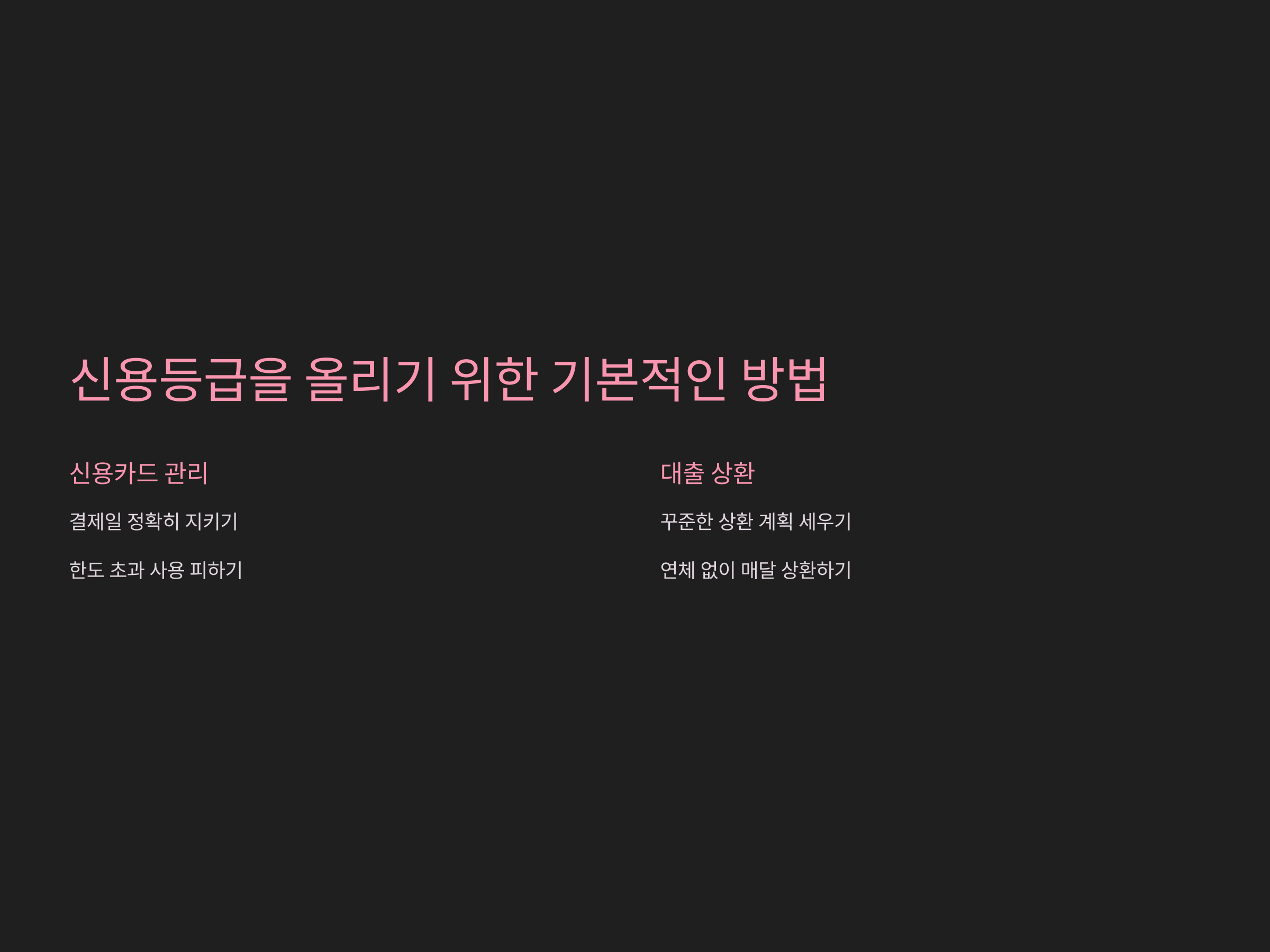 두 번째 방법은 대출 상환을 꾸준히 하는 것입니다. 대출을 받았다면 상환 계획을 세우고, 매달 빠짐없이 상환하는 것이 중요합니다. 만약 대출 상환이 밀리면 신용등급에 부정적인 영향을 미치기 때문에, 철저한 계획과 상환이 필수입니다.