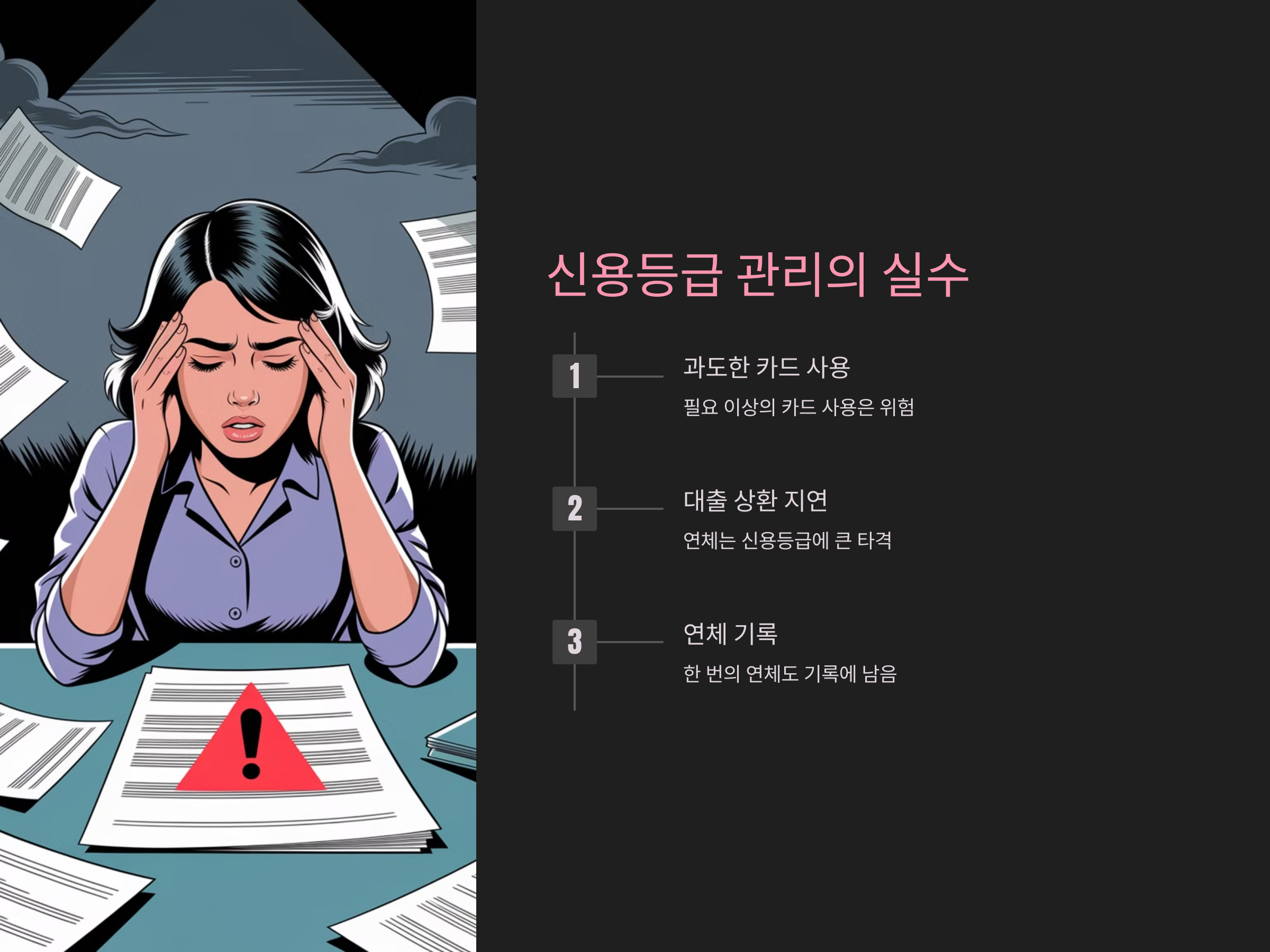 두 번째 실수는 대출 상환을 늦추는 것입니다. 대출 상환이 늦어지면 신용등급에 큰 타격을 줄 수 있습니다. 미리 상환 계획을 세우고, 정해진 일자에 맞춰서 갚는 것이 중요합니다.