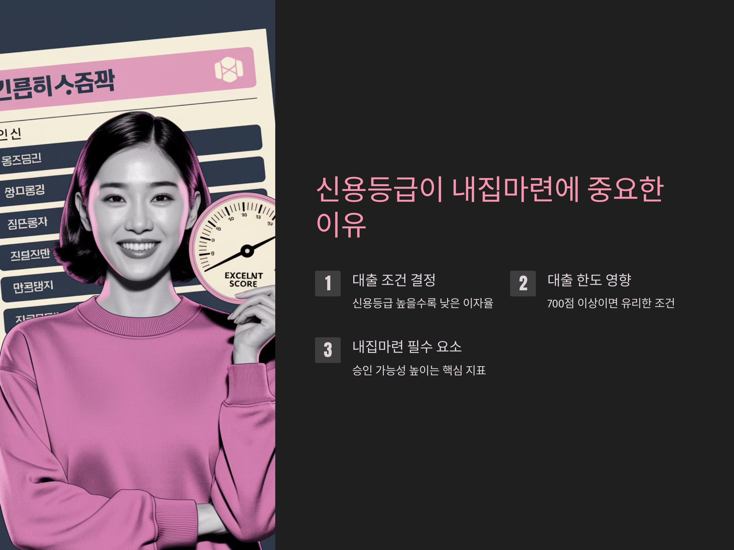 신용등급은 대출을 받을 때 금융기관이 개인의 상환 능력을 평가하는 지표입니다. 은행에서 대출을 받을 때 가장 중요한 요소 중 하나가 바로 신용등급이죠. 신용등급이 높을수록 대출 이자율이 낮고, 대출 한도가 높아지기 때문에 내집마련의 가장 중요한 조건으로 꼽힙니다.