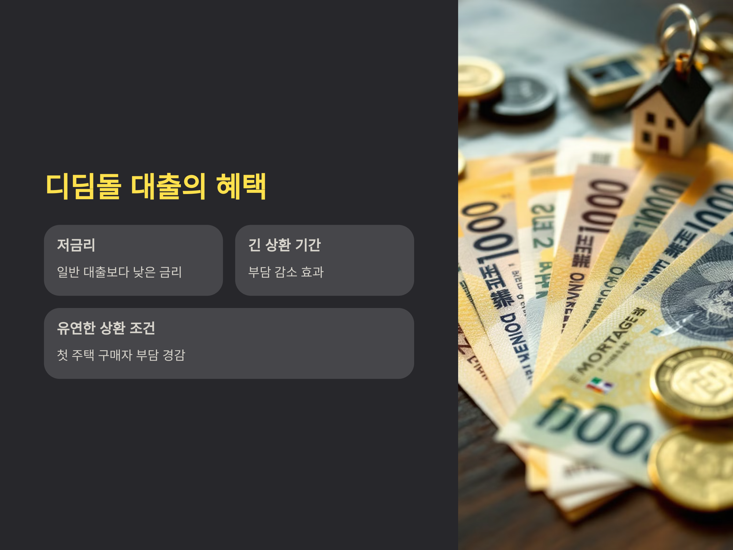 디딤돌 대출의 가장 큰 장점은 저금리라는 점입니다. 보통 주택 구입을 위해 대출을 받으면 높은 금리를 적용받기 쉬운데, 디딤돌 대출은 상대적으로 낮은 금리를 제공하여 장기적으로 큰 이점을 가질 수 있습니다. 또한, 대출 상환 기간이 길어지면 부담이 커지지만, 디딤돌 대출은 상환 조건이 유연하고 상환 기간도 길게 설정될 수 있기 때문에, 처음 집을 구입하는 사람들에게 부담을 덜어줍니다.