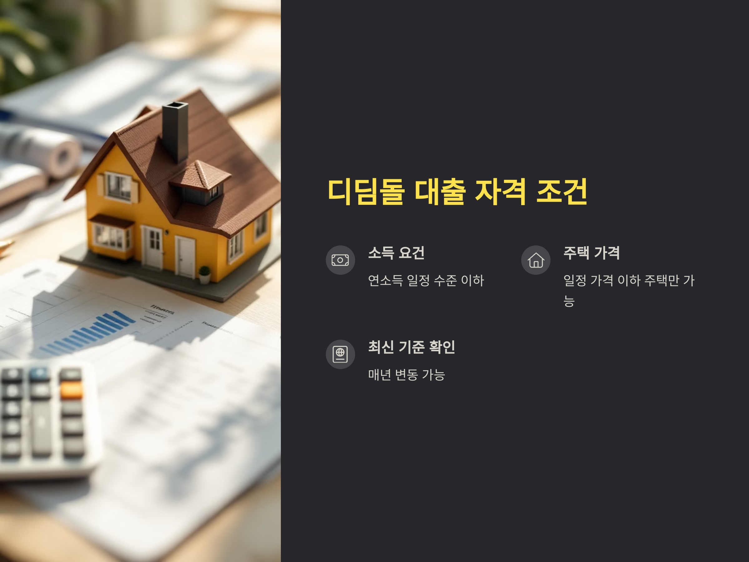 또한, 주택 가격도 디딤돌 대출 자격에 중요한 요소입니다. 디딤돌 대출은 주택 구매를 위한 대출이기 때문에, 구매하려는 주택이 일정 가격 이하일 경우에만 대출이 가능합니다. 이 가격 기준은 매년 조금씩 변동이 있을 수 있으며, 대출 신청 시 반드시 최신 주택 가격 기준을 확인해야 합니다.