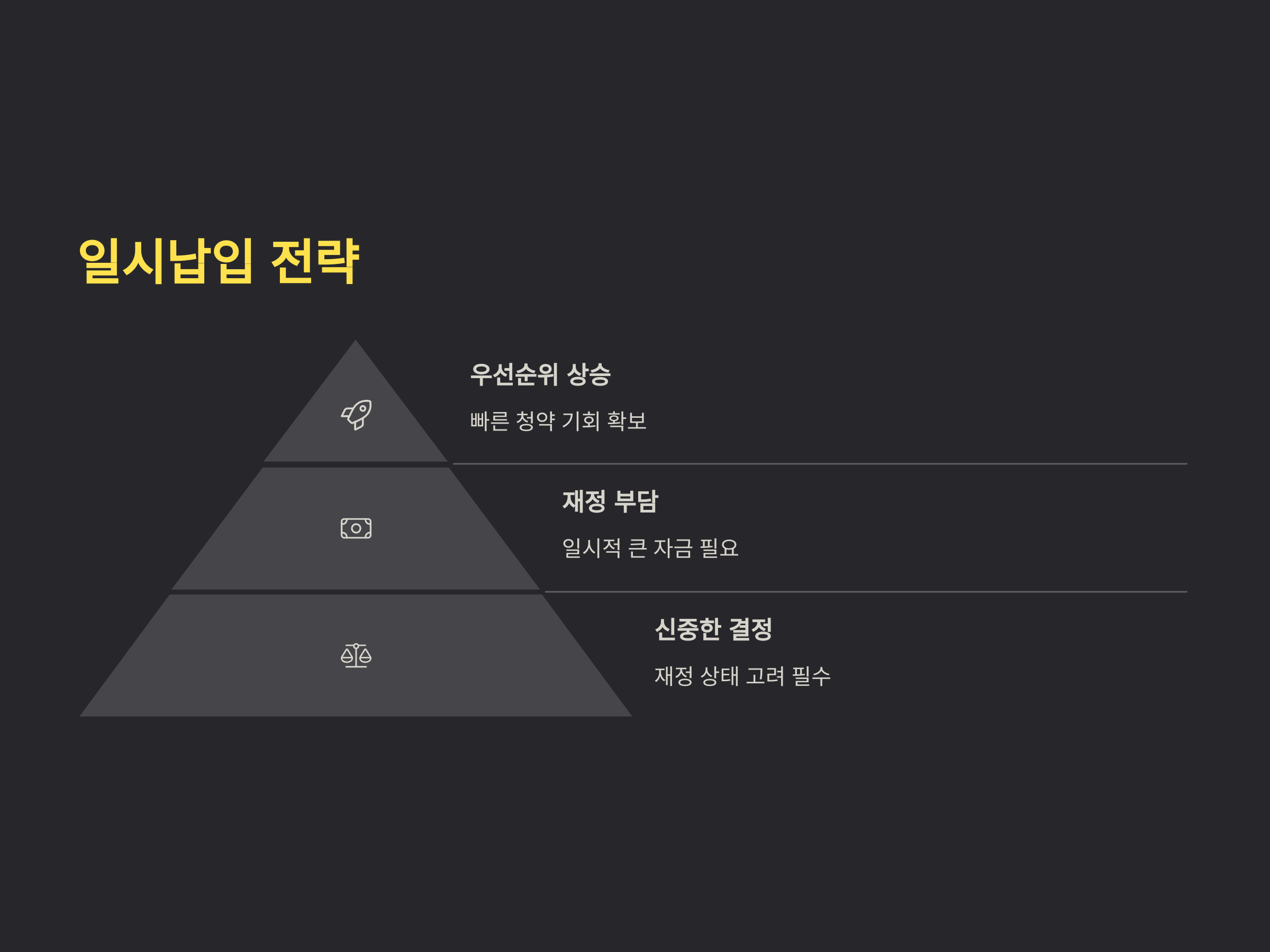다만, 일시납입은 일시적인 재정 부담이 크기 때문에, 자신의 재정 상태를 고려하여 신중하게 결정해야 합니다. 예를 들어, 어느 정도 여유 자금을 확보하고 있거나, 빠른 시간 내에 청약을 원할 경우 일시납입을 고려해볼 수 있습니다.