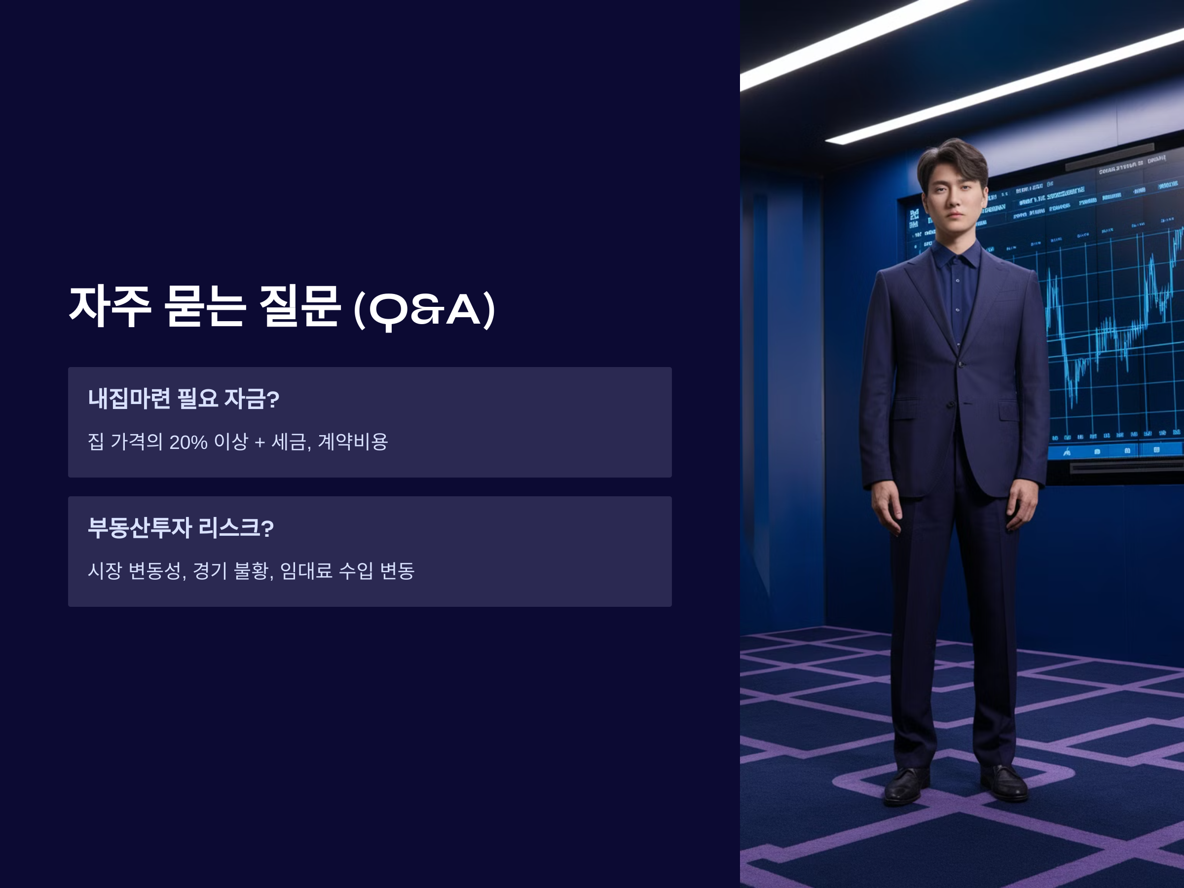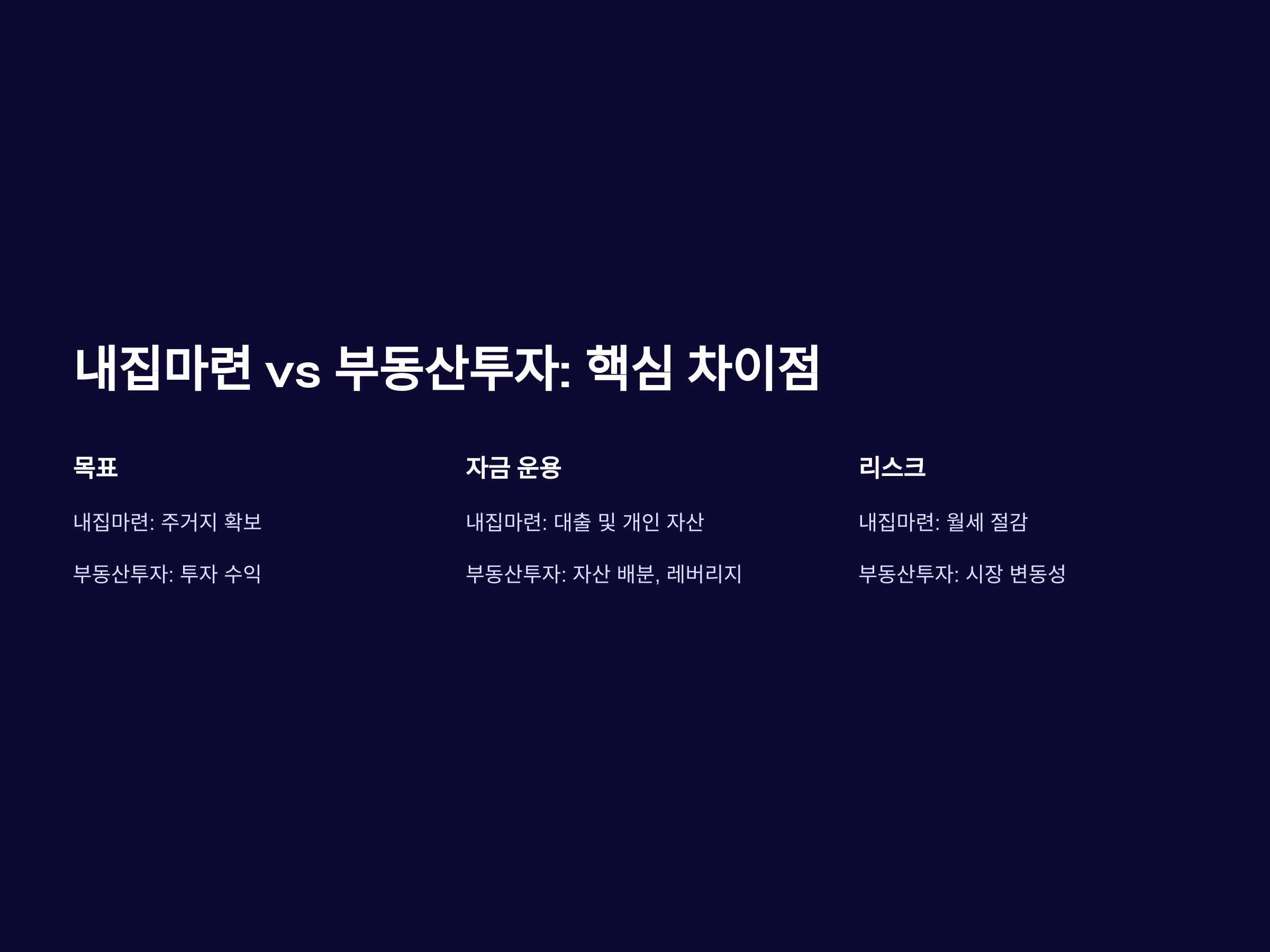 - 자산 축적의 목표: 부동산투자는 장기적인 자산 증대가 가능하나, 내집마련은 주거 안정을 제공합니다.