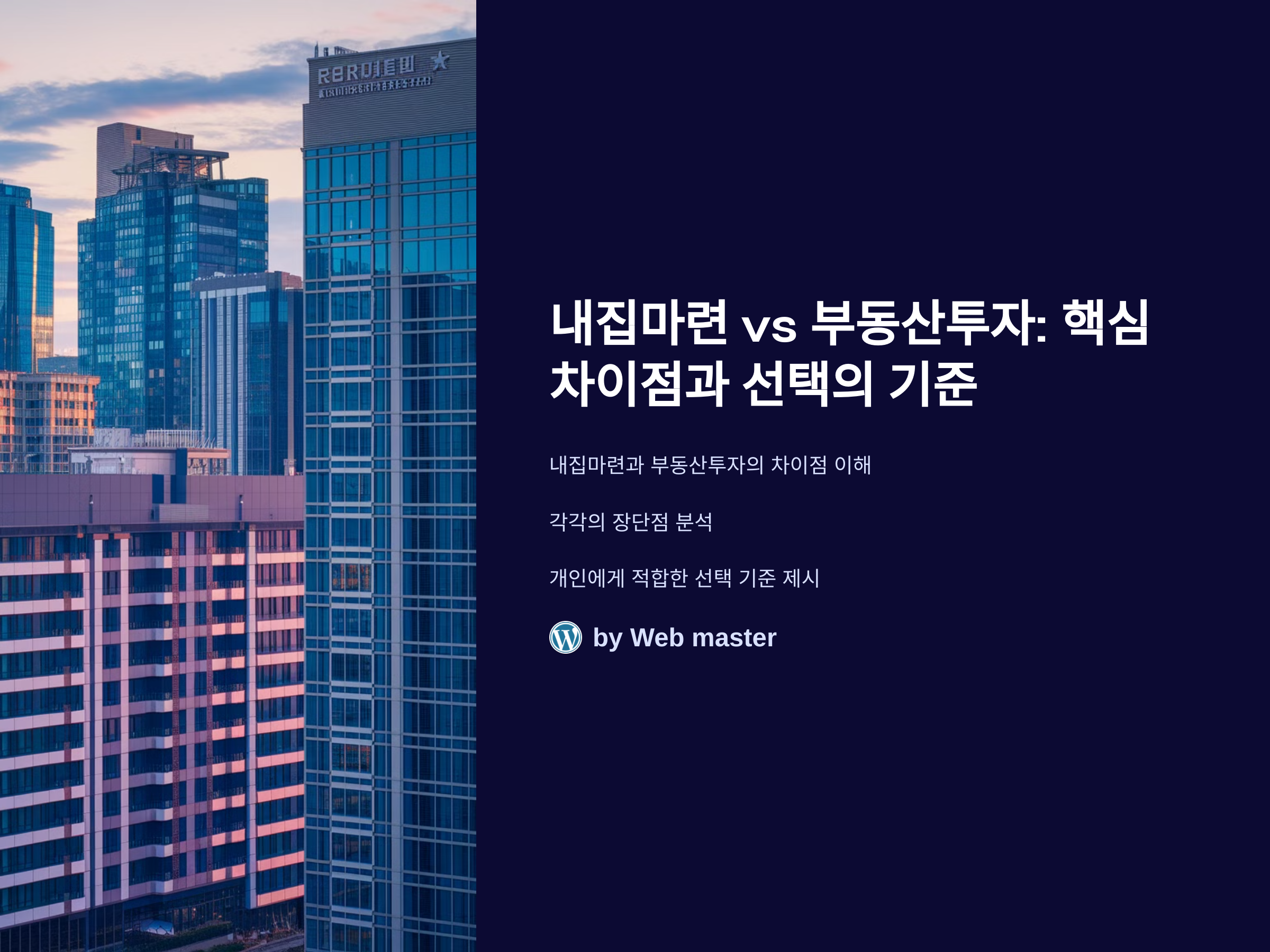 내집마련과 부동산투자는 각기 다른 장점과 단점을 가지고 있기 때문에, 자신이 원하는 목표에 맞는 선택을 하는 것이 중요합니다. 주거 안정을 우선시한다면 내집마련이 적합하며, 자산을 불리고자 한다면 부동산투자가 더 유리할 수 있습니다.