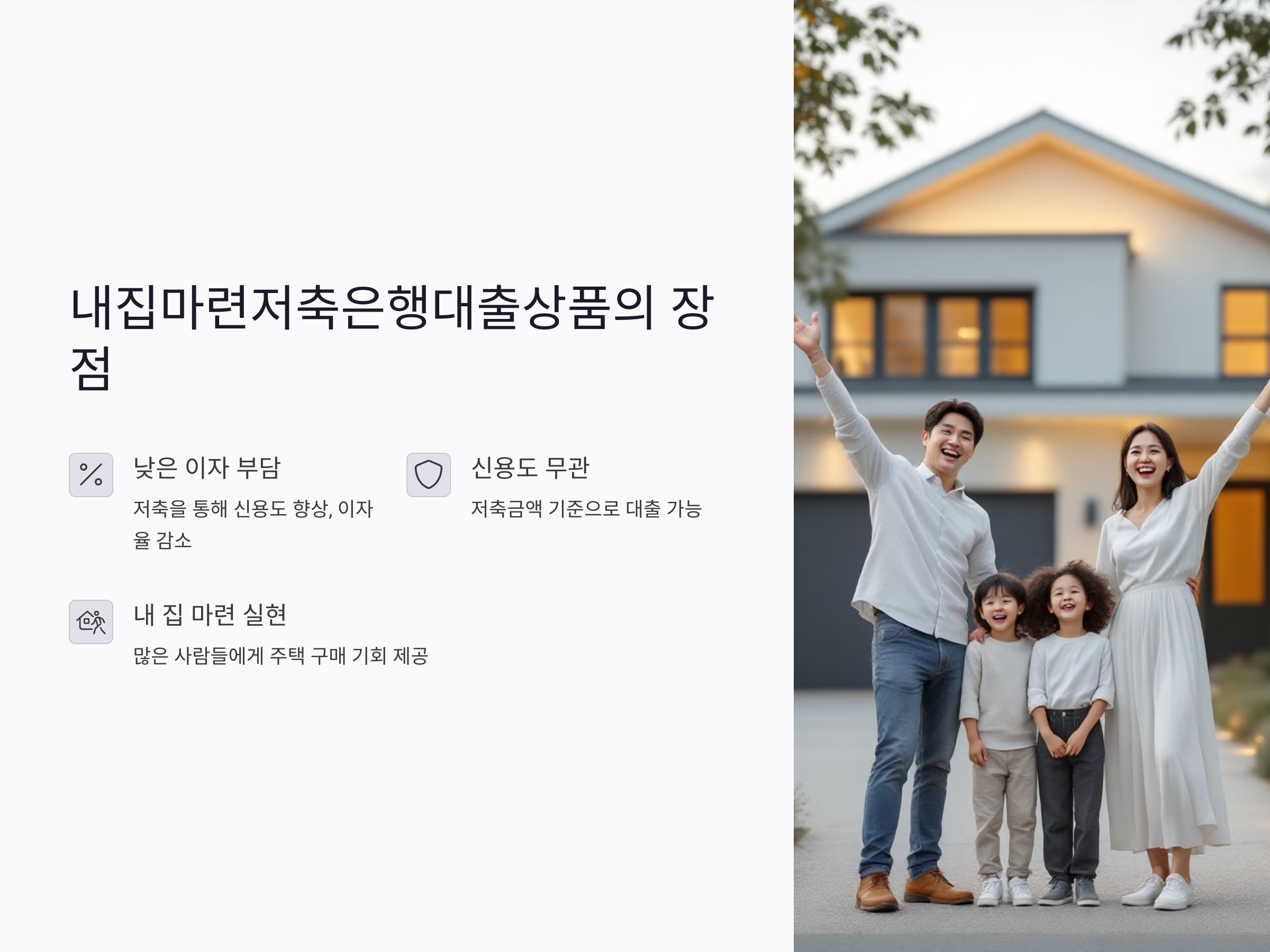 내집마련저축은행대출상품은 일정 기간 동안 저축을 하면 이자율이 낮아지고, 대출 한도가 커지는 장점이 있습니다. 특히 첫 주택을 구입하려는 분들에게 유리한 조건을 제공하는 경우가 많습니다.