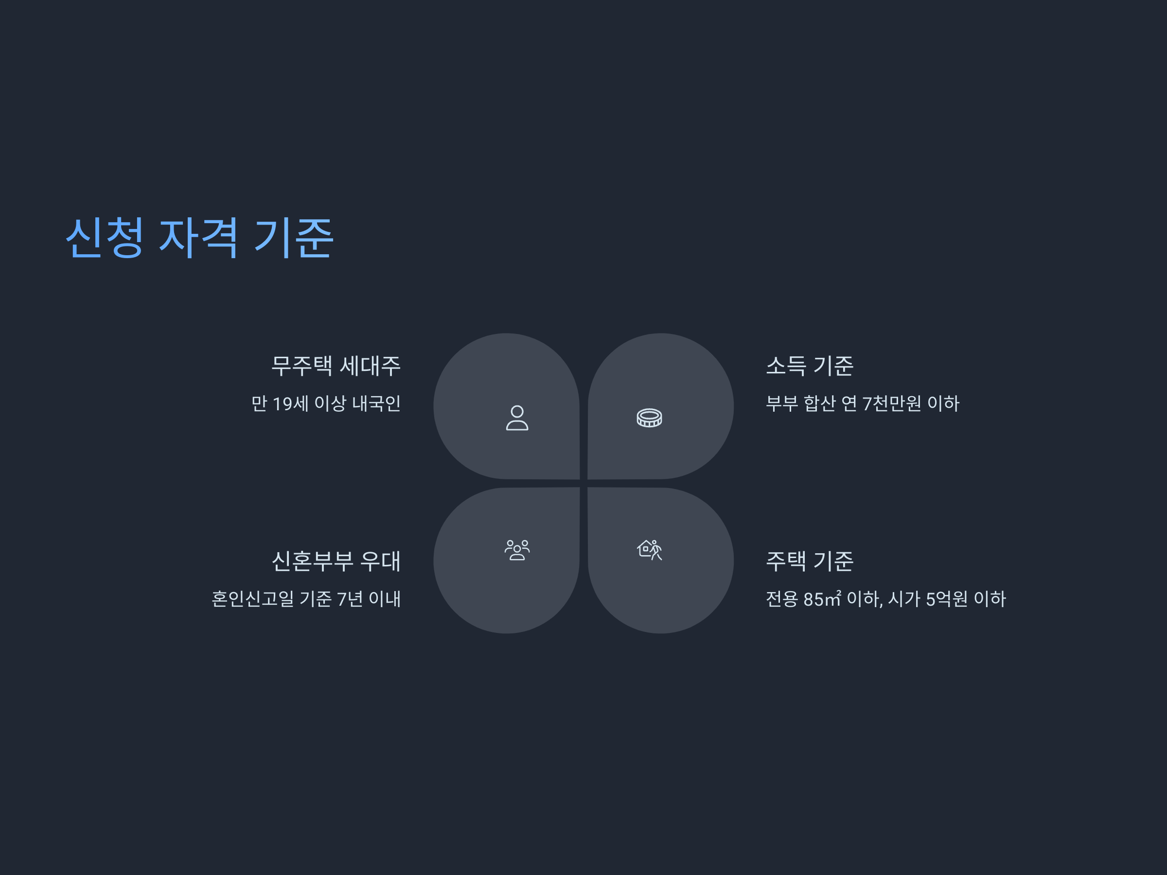 - 부부 합산 연 소득이 7천만 원 이하 (생애최초, 신혼부부는 8천5백만 원까지)