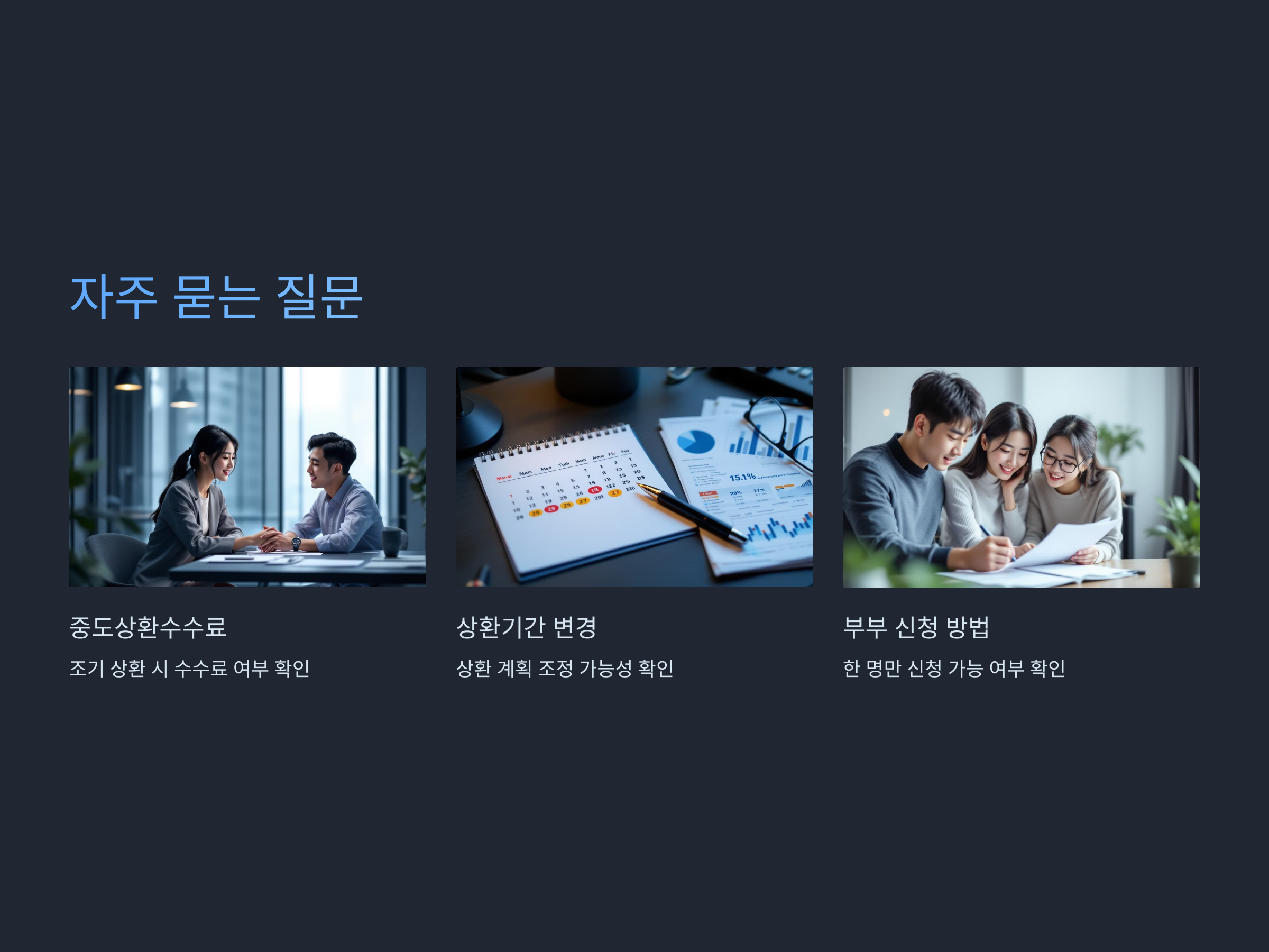 자주 묻는 질문 중에는 중도상환수수료 여부, 상환기간 변경 가능성, 부부 중 한 명만 신청 가능 여부 등이 있습니다. 대부분의 경우 상세 설명이 주택금융공사 Q&A 페이지에 안내되어 있으니 참고 바랍니다.