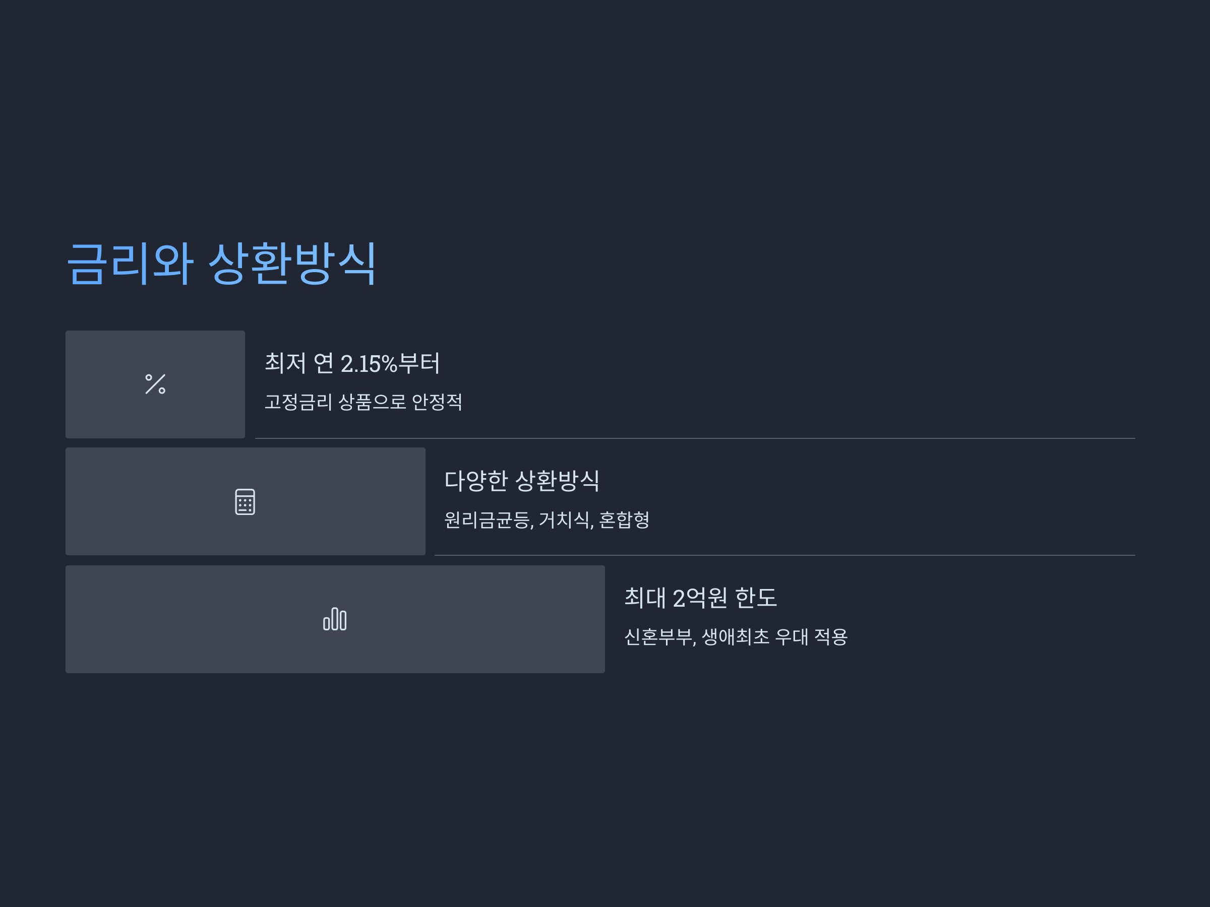 총 대출 가능 한도는 최대 2억 원까지이며, 신혼부부나 생애 최초 주택 구매자는 우대 조건이 추가 적용되어 더 낮은 금리를 받을 수 있습니다.