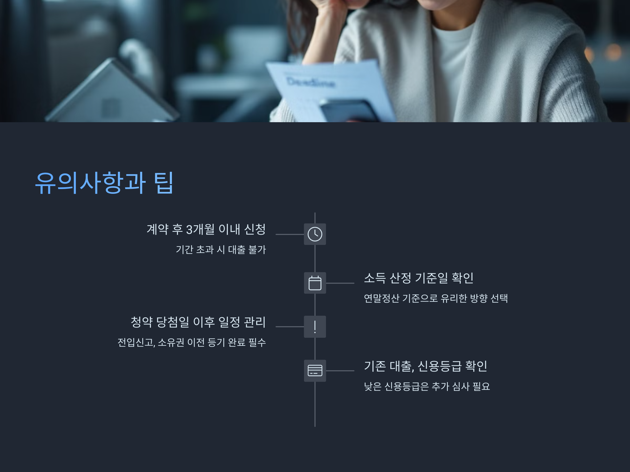 또한 신혼부부의 경우 혼인신고일 기준 7년 이내여야 하며, 자녀 수에 따라 우대금리가 추가 적용됩니다. 소득 기준과 주택 기준 모두 충족해야 하며, 청약 당첨 이후 대출 신청 가능 기간도 있으므로 일정 관리가 중요합니다.
