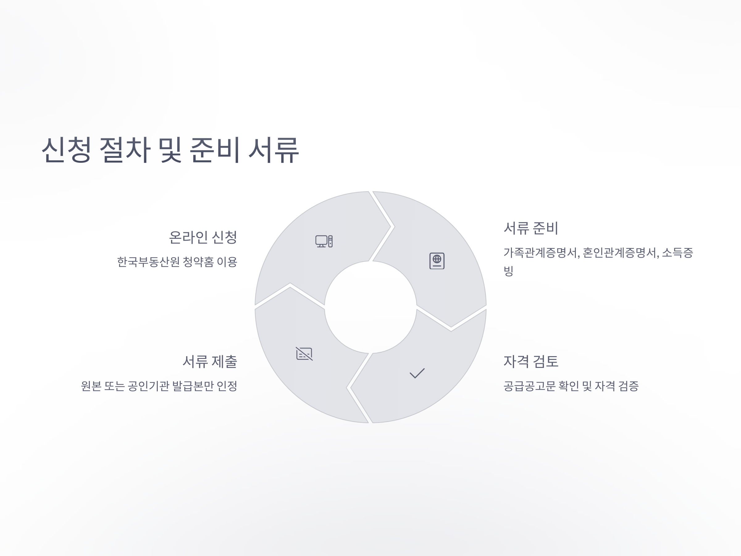 신혼부부 특별공급 신청은 한국부동산원 청약홈에서 온라인으로 진행됩니다. 신청 전에는 해당 단지의 공급 공고문을 꼼꼼히 읽어야 하며, 청약 자격 검토와 함께 관련 서류를 철저히 준비해야 합니다. 주요 서류로는 가족관계증명서, 혼인관계증명서, 주민등록등본, 소득 및 자산 관련 서류가 있으며, 예비신혼부부는 혼인 예정 증빙자료(청첩장, 혼인신고예정확인서 등)를 제출해야 합니다.