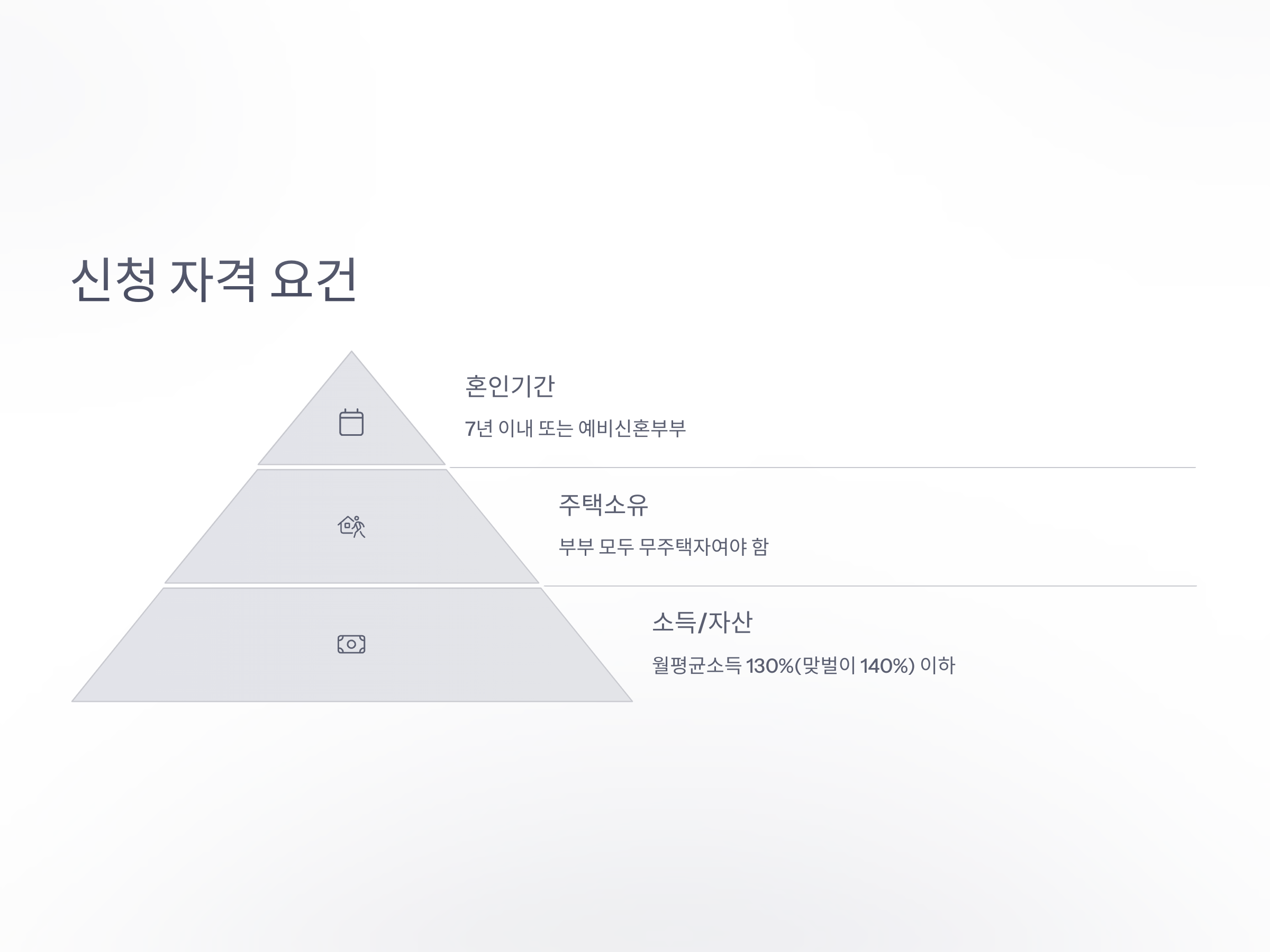 특별공급 신청 자격은 다음 세 가지 기준을 충족해야 합니다. 첫째, 혼인기간 7년 이내이거나 혼인 예정자여야 하며, 둘째, 청약 신청자와 배우자 모두 무주택자여야 합니다. 셋째, 소득과 자산 기준을 충족해야 하는데, 월 평균소득은 도시근로자 가구당 월평균 소득의 130%(맞벌이 140%) 이하, 자산은 부동산과 자동차를 포함하여 일정 한도 내에 있어야 합니다.
