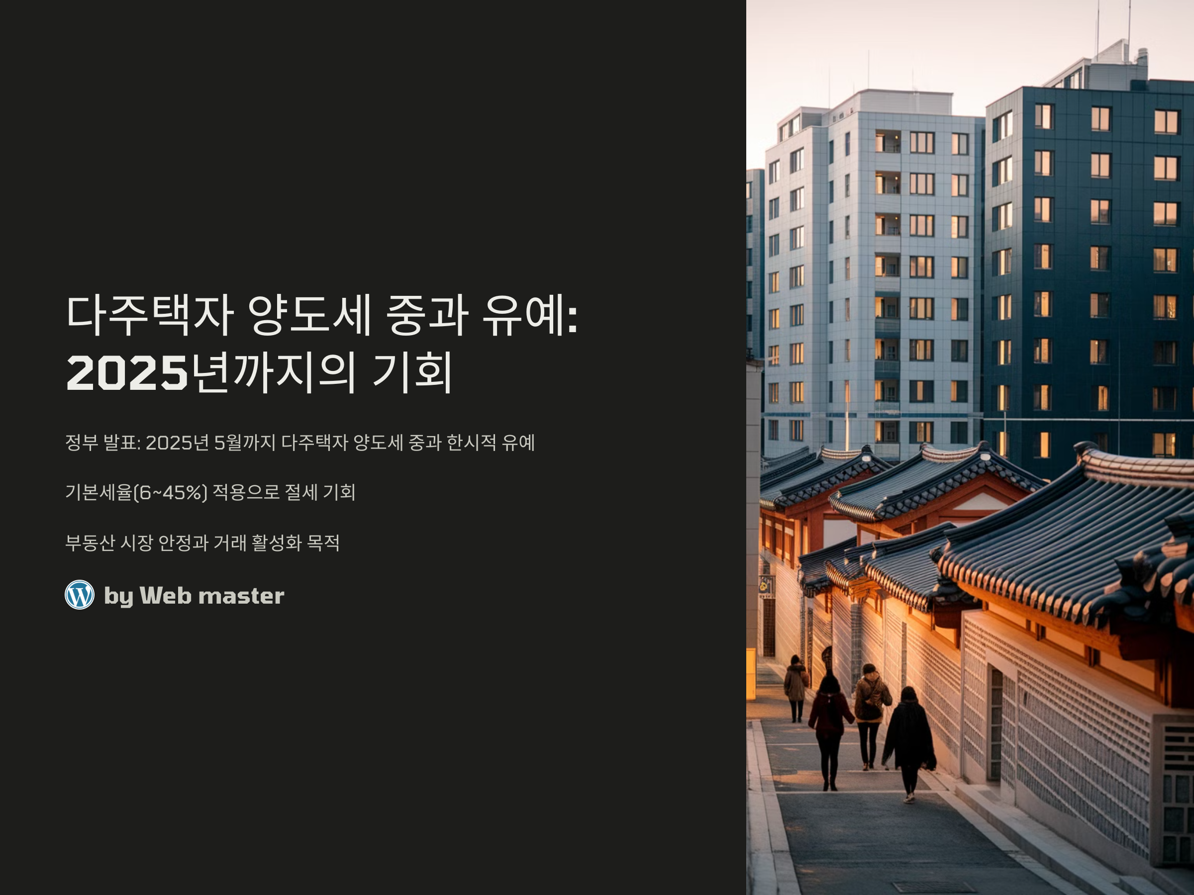 최근 정부가 다주택자에 대한 양도소득세 중과를 2025년 5월까지 한시적으로 유예하기로 발표했습니다. 이에 따라 다주택자들은 중과세율이 아닌 기본세율(6~45%)만 적용받아 절세할 수 있는 기회를 얻게 되었습니다. 이번 조치는 부동산 시장의 안정과 거래 활성화를 목적으로 시행된 것으로, 다주택자들에게 중요한 의미를 가집니다.