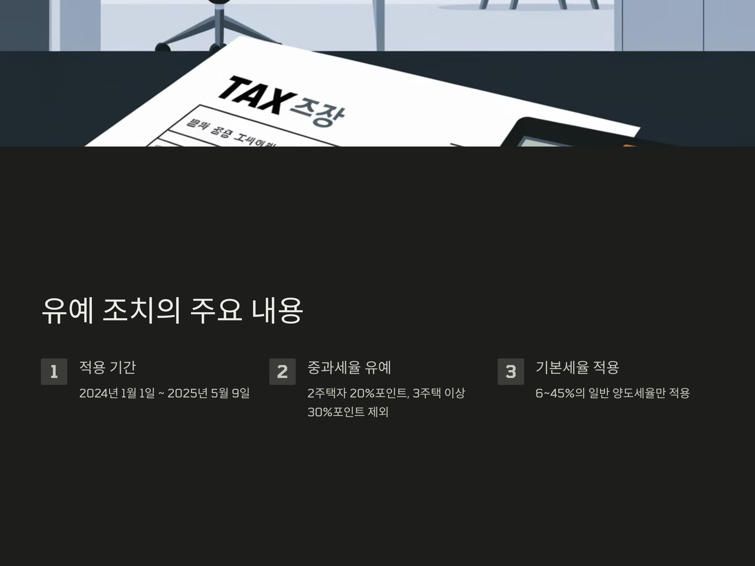 - 중과세율 유예: 기존 2주택자 20%포인트, 3주택 이상 30%포인트 중과세율 적용 제외