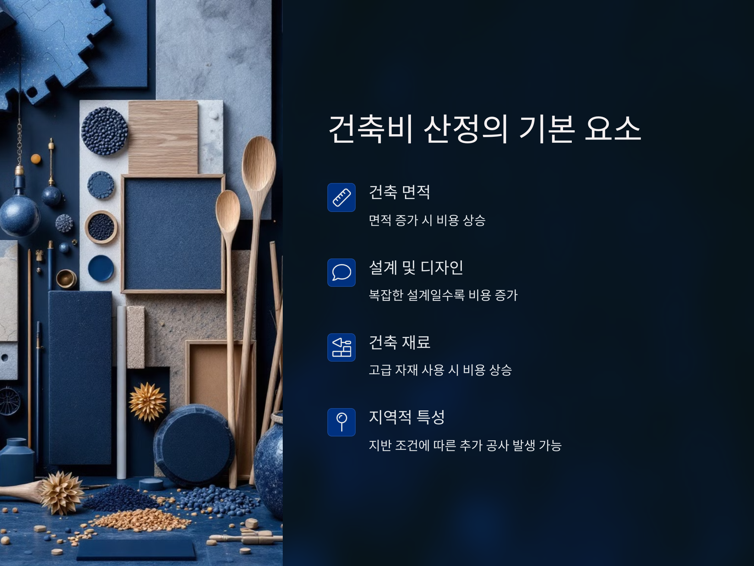 건축비 산정은 단순히 건물의 크기와 디자인만 고려하는 것이 아니라, 지반 조건, 지역적 특성, 건축 재료, 공사 기간 등 여러 변수를 종합적으로 고려해야 합니다. 이를 통해 불필요한 비용을 줄이고, 실제 예산과 차이를 최소화할 수 있는 방법을 알아보겠습니다.