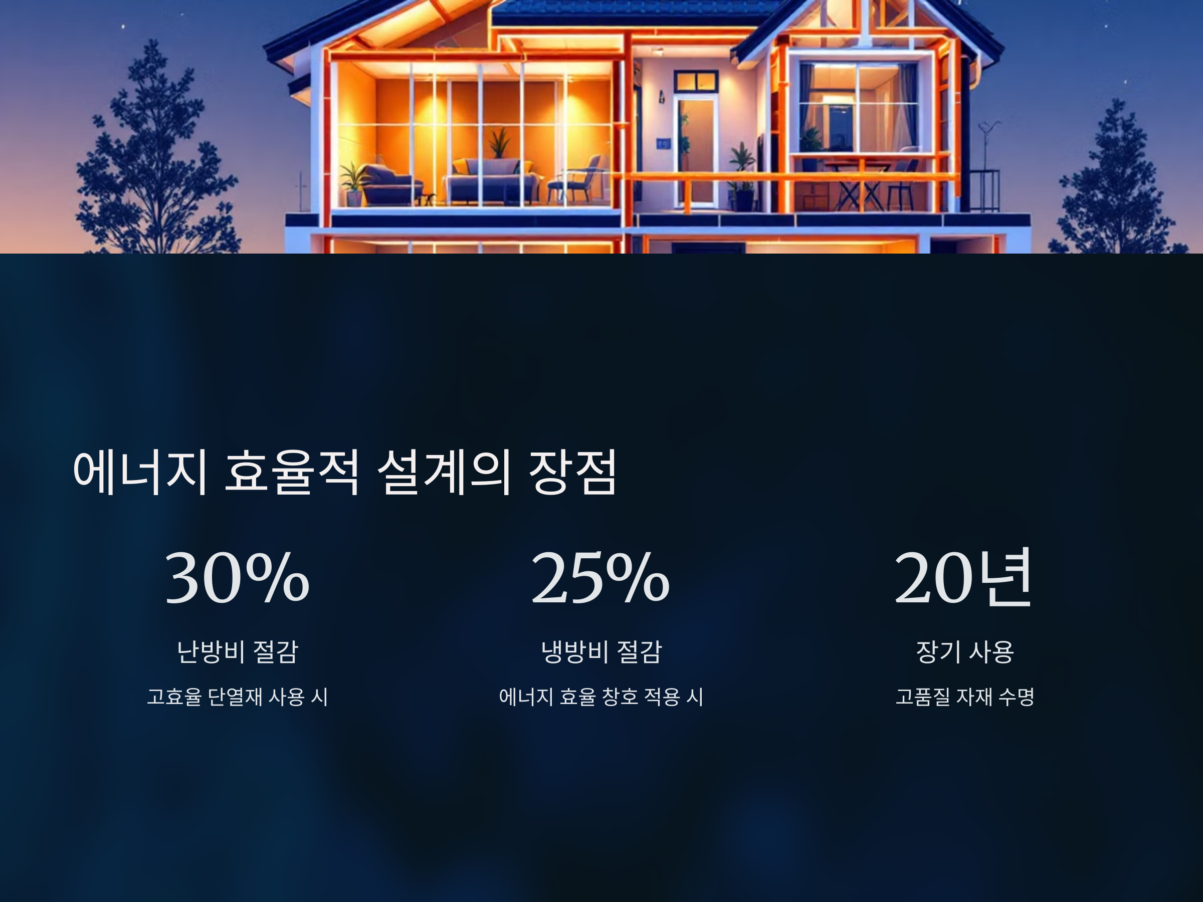 에너지 효율성을 고려한 설계와 자재 선택은 장기적으로 비용 절감 효과를 가져올 수 있습니다. 초기에 고급 단열재나 창호를 선택하면 건축비가 높아지지만, 장기적으로 난방비나 냉방비를 절감할 수 있어 결과적으로 비용을 절감할 수 있습니다. 또한, 태양광 패널이나 지열 시스템을 설치하면 에너지 비용을 절감할 수 있는 방법도 고려할 수 있습니다.