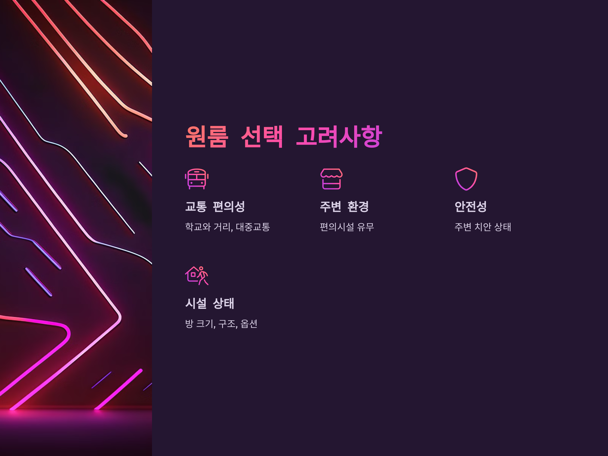 대학생들이 원룸을 선택할 때 중요하게 고려하는 요소는 다음과 같습니다: