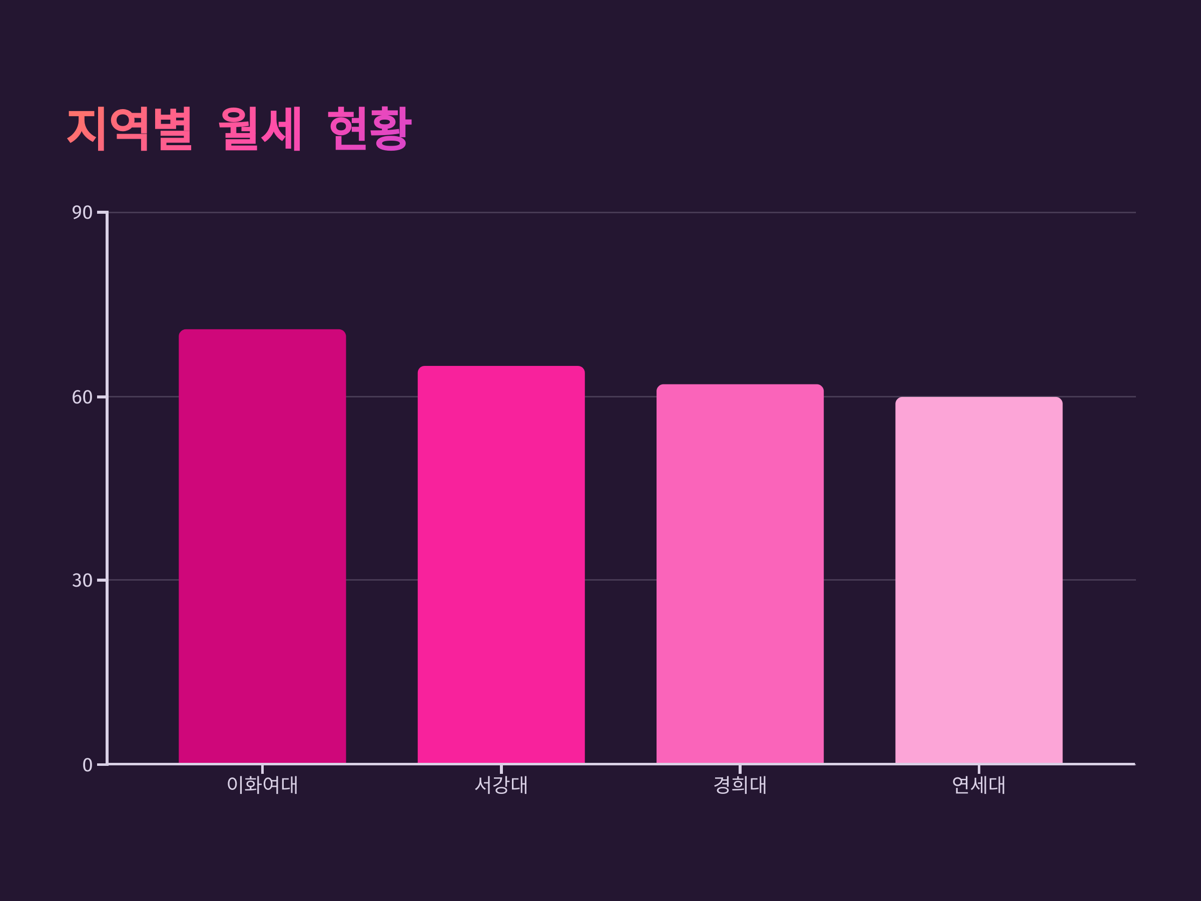 지역별로 살펴보면, 이화여대 인근 원룸의 평균 월세는 71만 원으로 가장 높았으며, 서강대(65만 원), 경희대(62만 원), 연세대(60만 원) 순으로 나타났습니다. citeturn0search8 이러한 임대료 상승은 학생들의 주거비 부담을 가중시키고 있습니다.