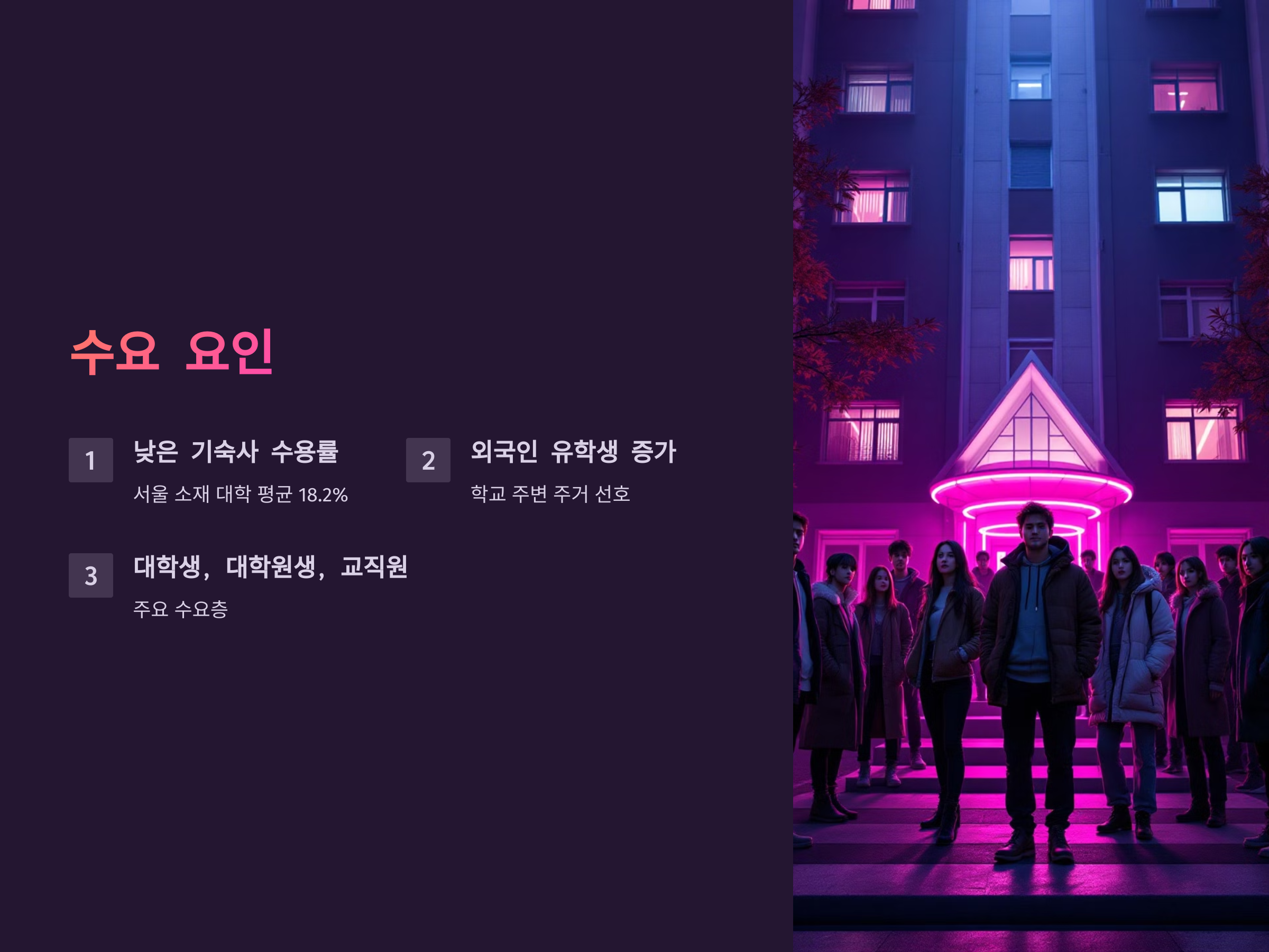 대학가 원룸의 수요는 주로 대학생, 대학원생, 교직원 등으로부터 발생합니다. 특히, 기숙사 수용률이 낮은 대학의 경우 원룸에 대한 수요가 더욱 높습니다. 예를 들어, 서울 소재 대학들의 평균 기숙사 수용률은 18.2%로, 많은 학생들이 원룸을 선택할 수밖에 없는 상황입니다. citeturn0search13