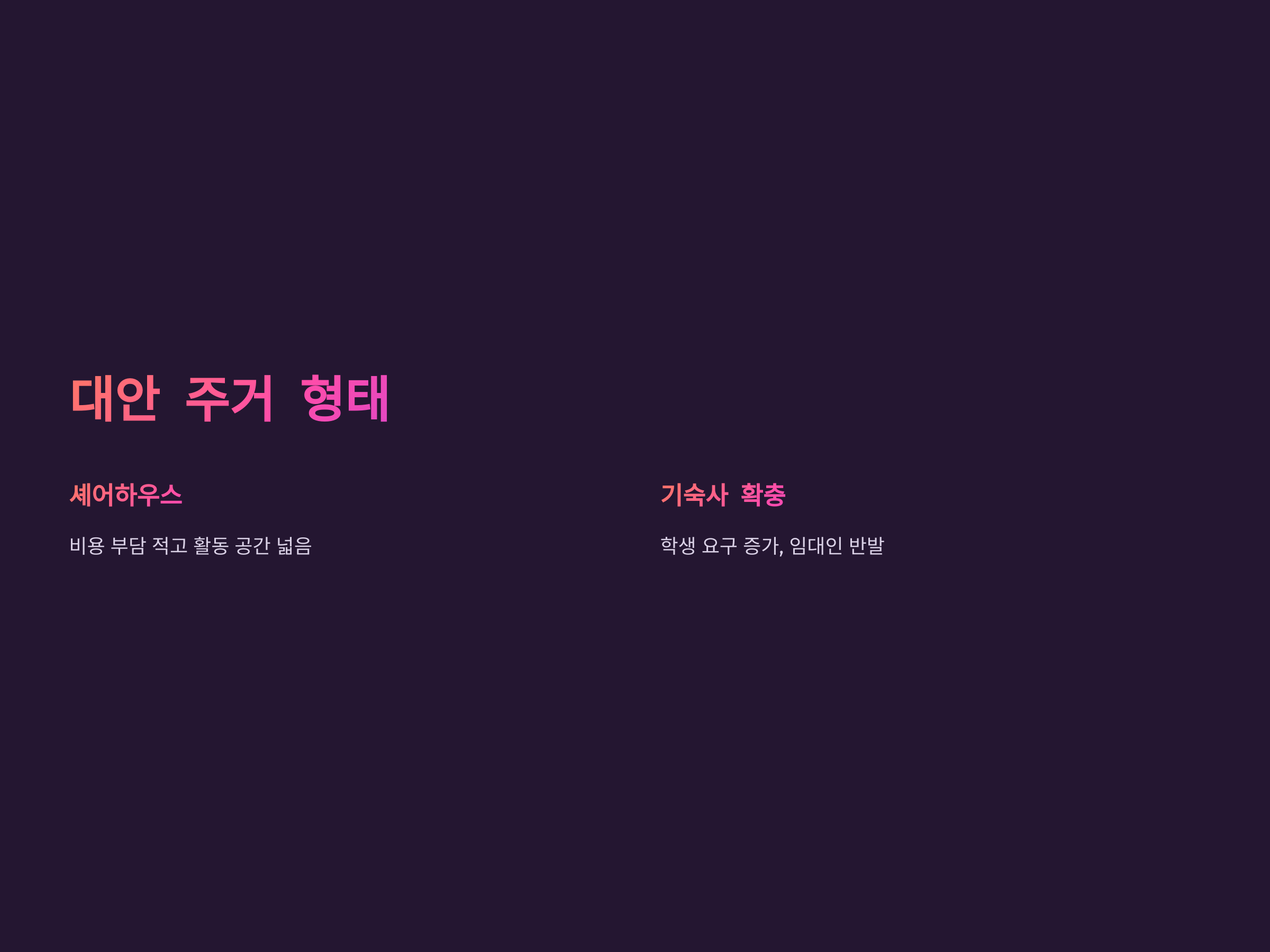 최근 원룸 임대료 상승으로 인해 대학생들은 셰어하우스와 같은 대안적인 주거 형태에 눈을 돌리고 있습니다. 셰어하우스는 원룸보다 비용 부담이 적고, 활동 공간이 넓어 선호도가 높아지고 있습니다. citeturn0search11