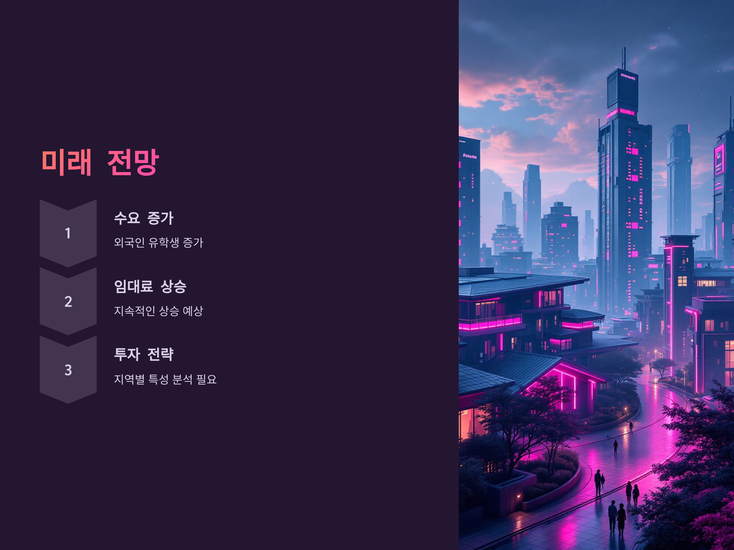 대학가 원룸 시장은 지속적인 수요 증가와 함께 임대료 상승 추세가 이어질 것으로 예상됩니다. 특히, 외국인 유학생의 증가와 대학 기숙사 수용률의 한계로 인해 원룸에 대한 수요는 꾸준히 유지될 것으로 보입니다.