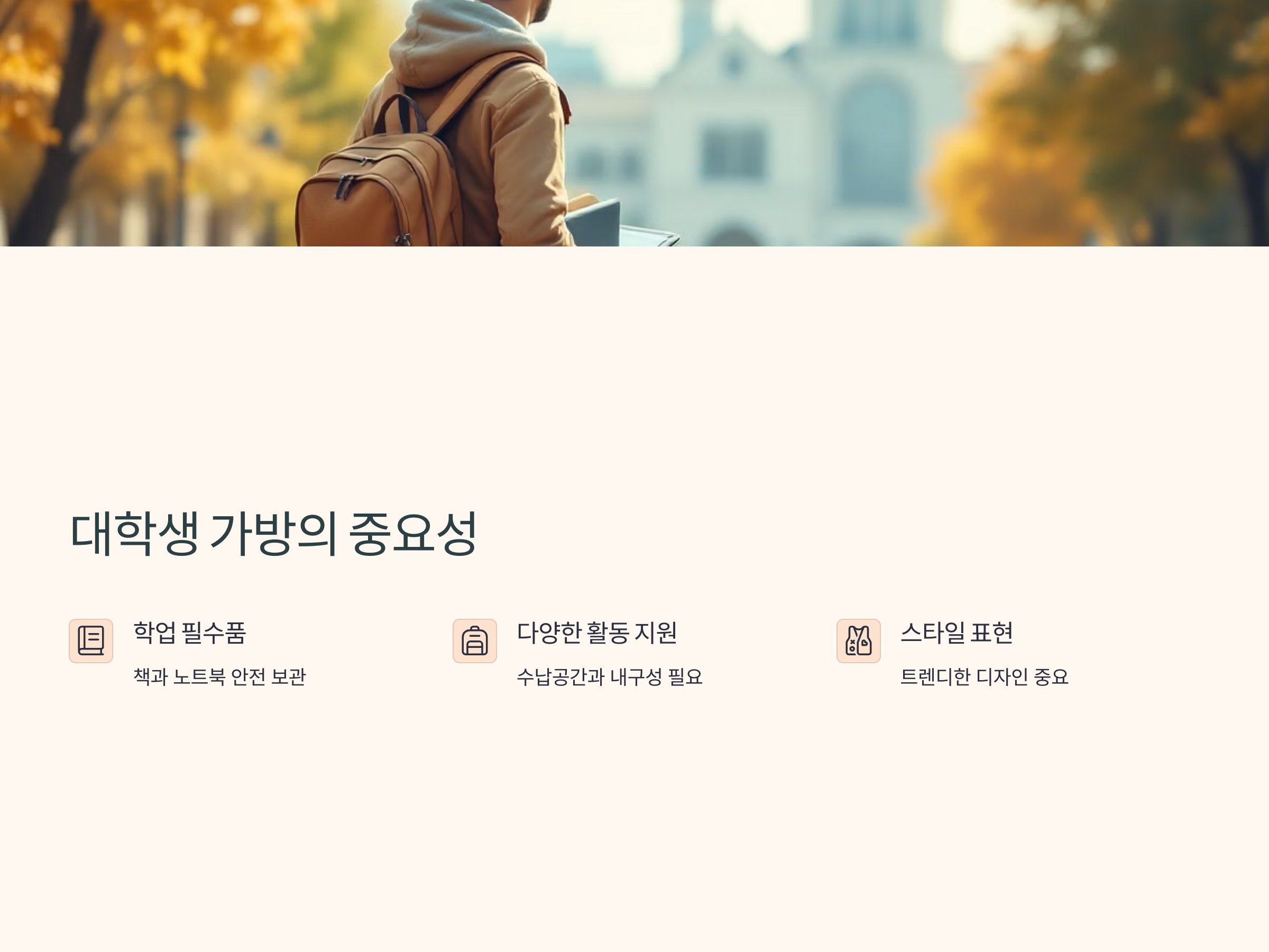 대학생 가방을 선택할 때는 디자인뿐만 아니라 실용성도 중요한 요소입니다. 책, 노트북, 개인 소지품을 모두 안전하게 담을 수 있어야 하며, 다양한 활동을 하는 대학생들에게는 내구성이 뛰어난 가방이 필요합니다. 또한, 자신의 스타일에 맞는 디자인을 선택하는 것도 중요한 포인트입니다.