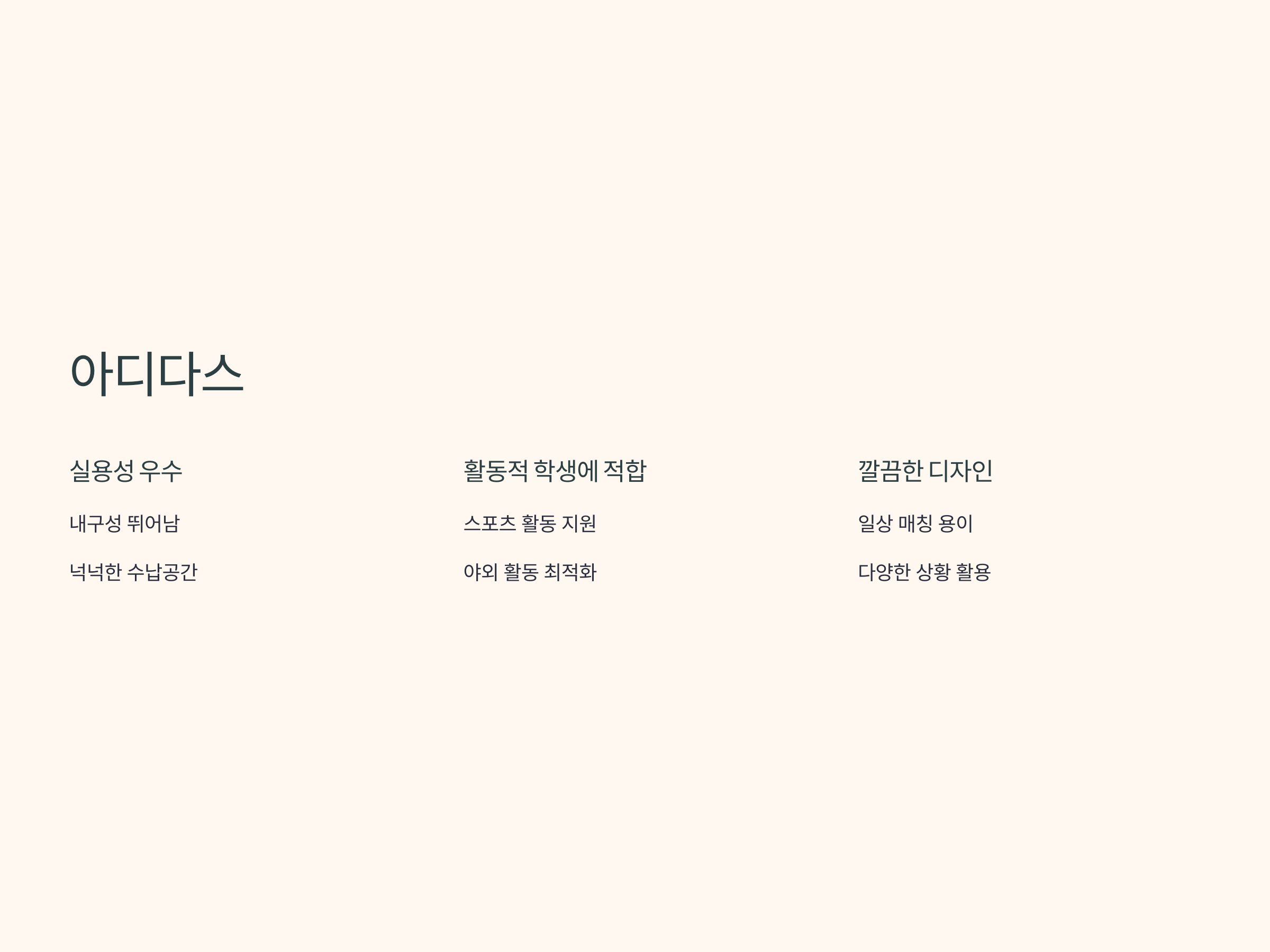 아디다스의 가방은 특히 스포츠 활동이나 야외 활동이 많은 대학생들에게 유용합니다. 운동을 좋아하거나 학교 외 활동을 자주 하는 학생들에게는 아디다스가 매우 적합한 선택이 될 수 있습니다. 또한, 깔끔한 디자인으로 일상적인 사용에도 부담 없이 매칭할 수 있어 다양한 상황에서 활용 가능합니다.