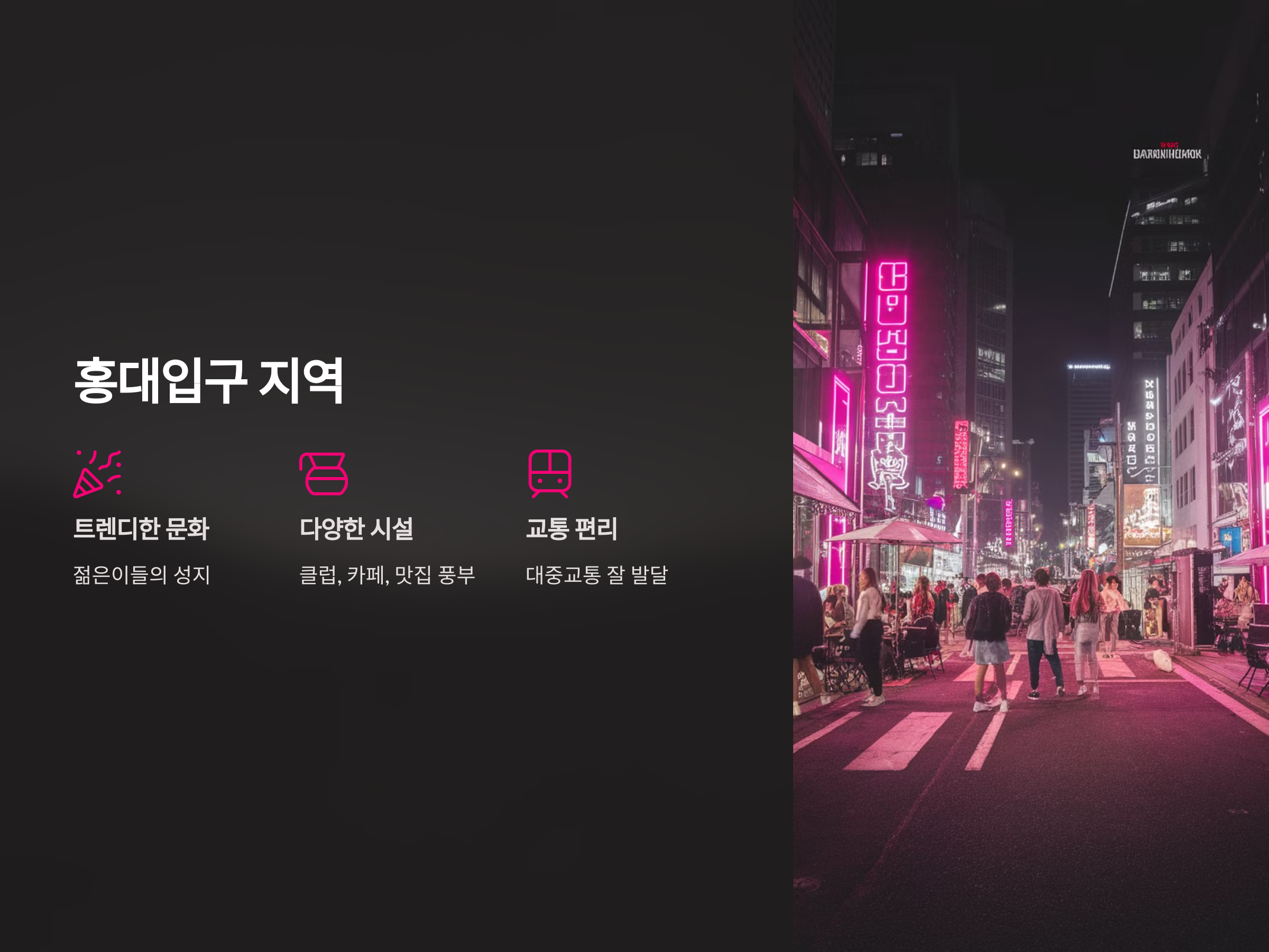 홍대는 젊은이들이 가장 많이 모이는 지역 중 하나입니다. 홍대입구 주변은 클럽, 카페, 맛집 등이 많아 하루 종일 지루할 틈이 없습니다. 이 지역은 서울에서 가장 핫한 장소 중 하나로, 다양한 문화와 트렌드가 형성되어 있어 많은 대학생들이 선호하는 지역입니다.