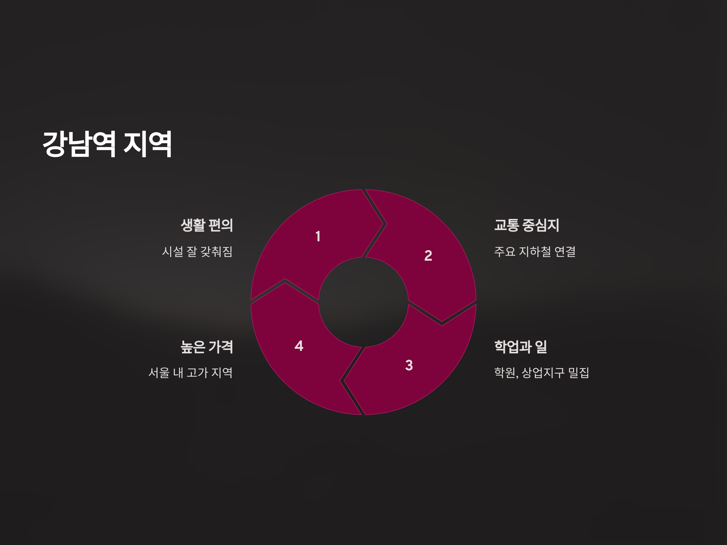 강남은 대학생들뿐만 아니라 직장인들이 많이 거주하는 지역으로, 생활 편의시설이 잘 갖춰져 있어 편리합니다. 강남역은 주요 지하철 노선이 모여 있는 지역으로 교통도 매우 편리합니다. 원룸 가격은 서울 내에서도 높은 편에 속하지만, 주변의 학원, 카페 등 다양한 시설 덕분에 가격 대비 높은 만족도를 제공합니다.