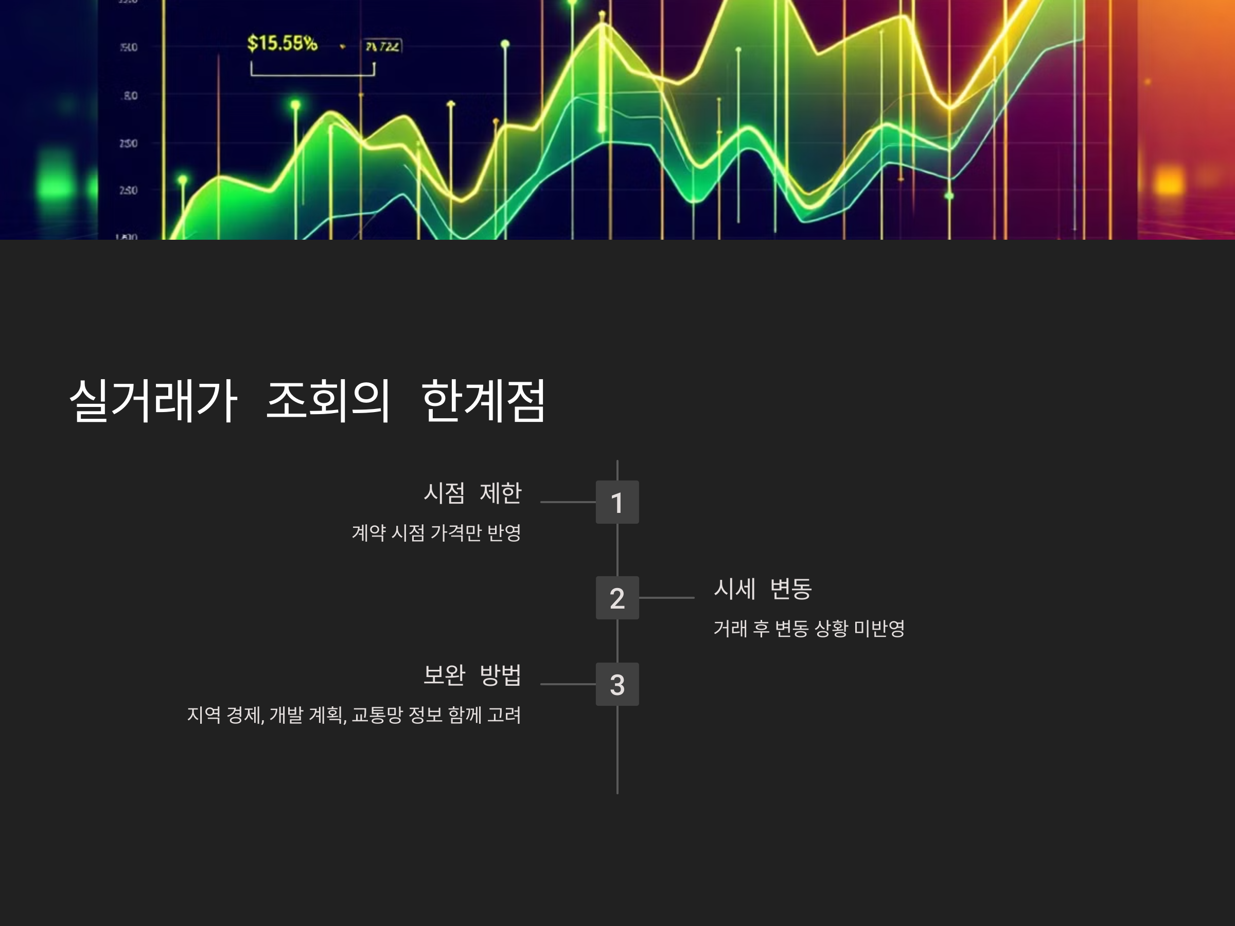 이를 보완하기 위해, 실거래가만 보는 것이 아니라 해당 지역의 경제적 변화, 개발 예정지 정보, 교통망 개선 등 다양한 외부 요인들을 함께 고려하는 것이 중요합니다. 전문가의 조언을 받는 것도 좋은 방법입니다.