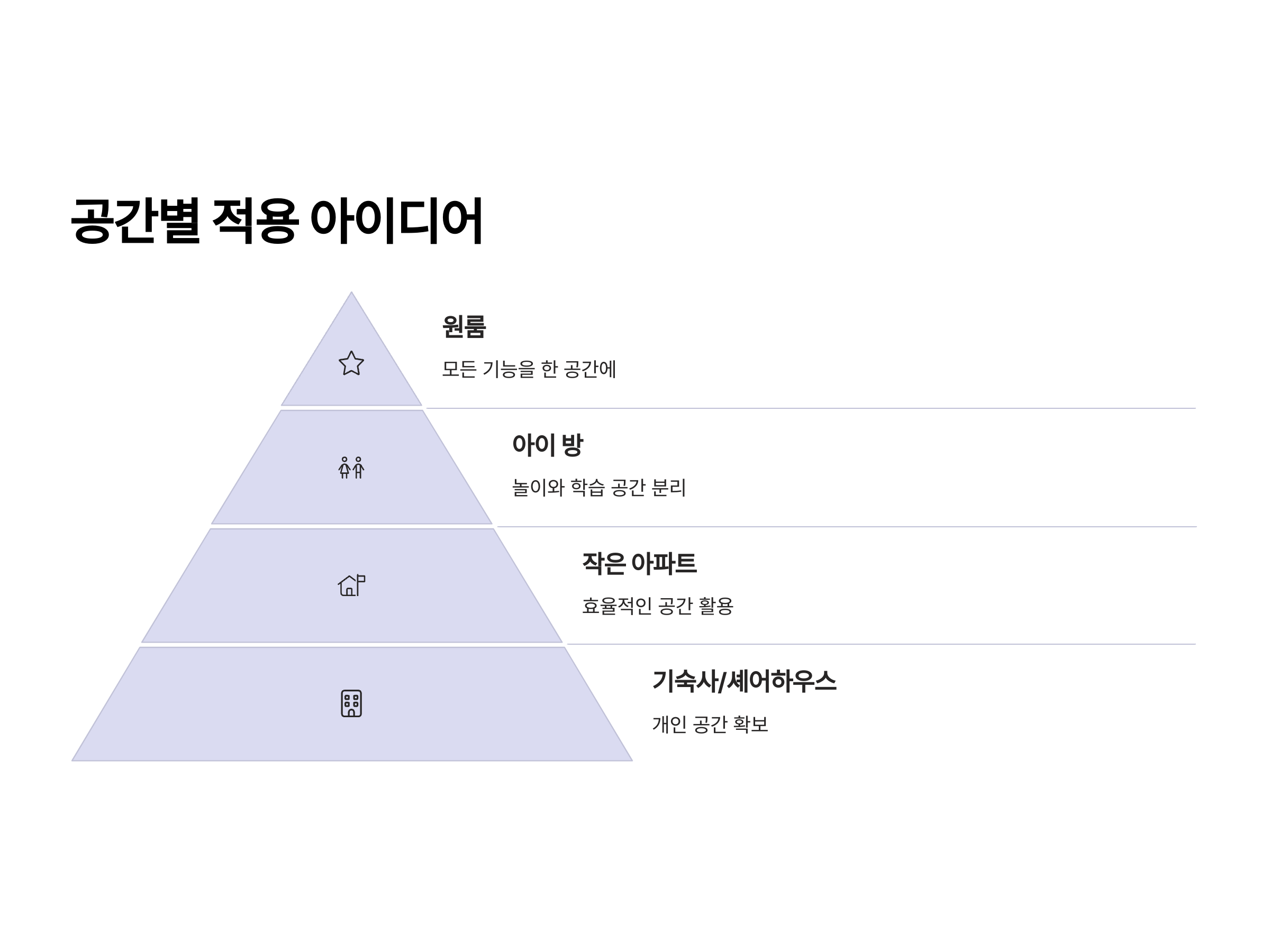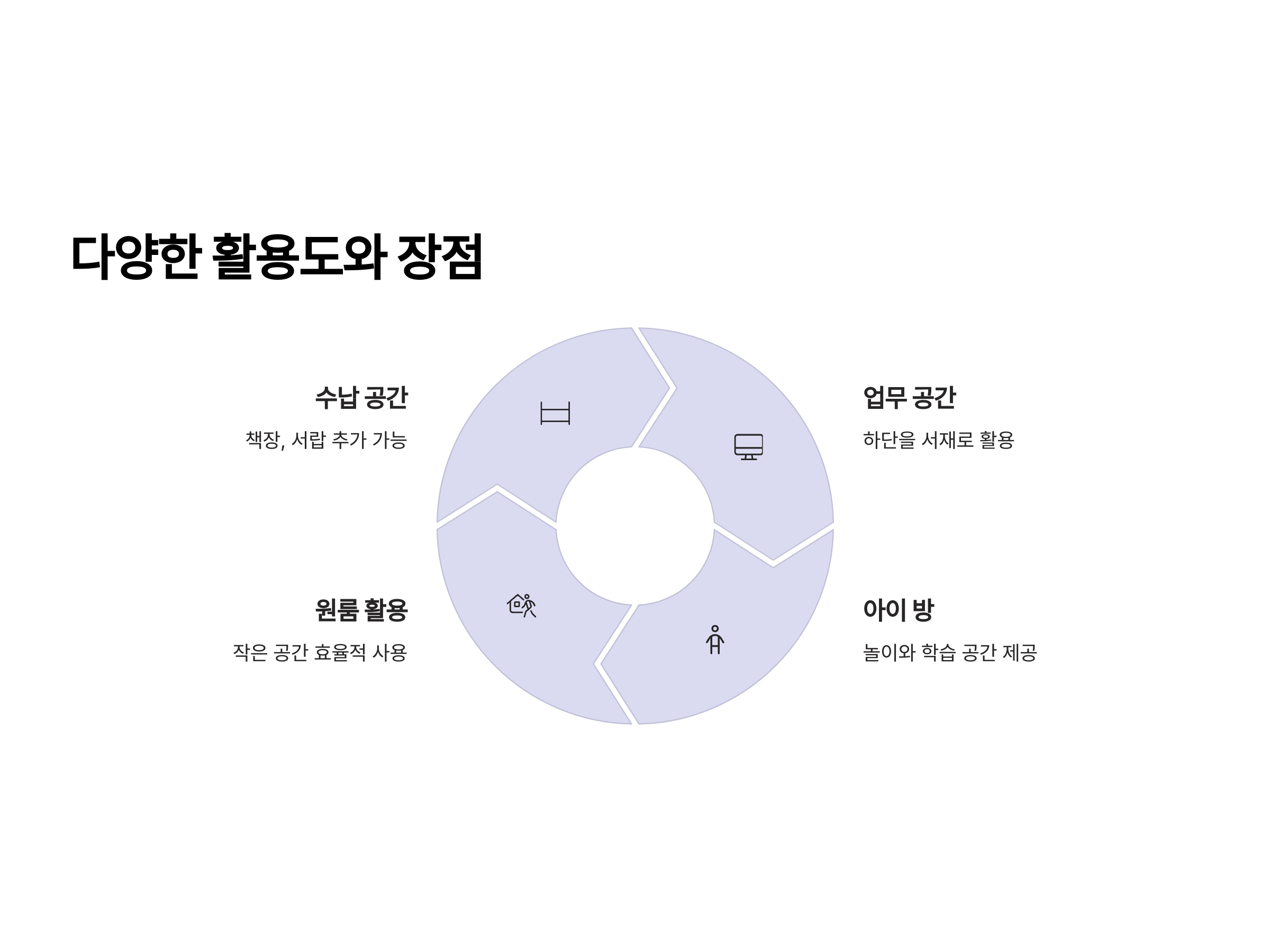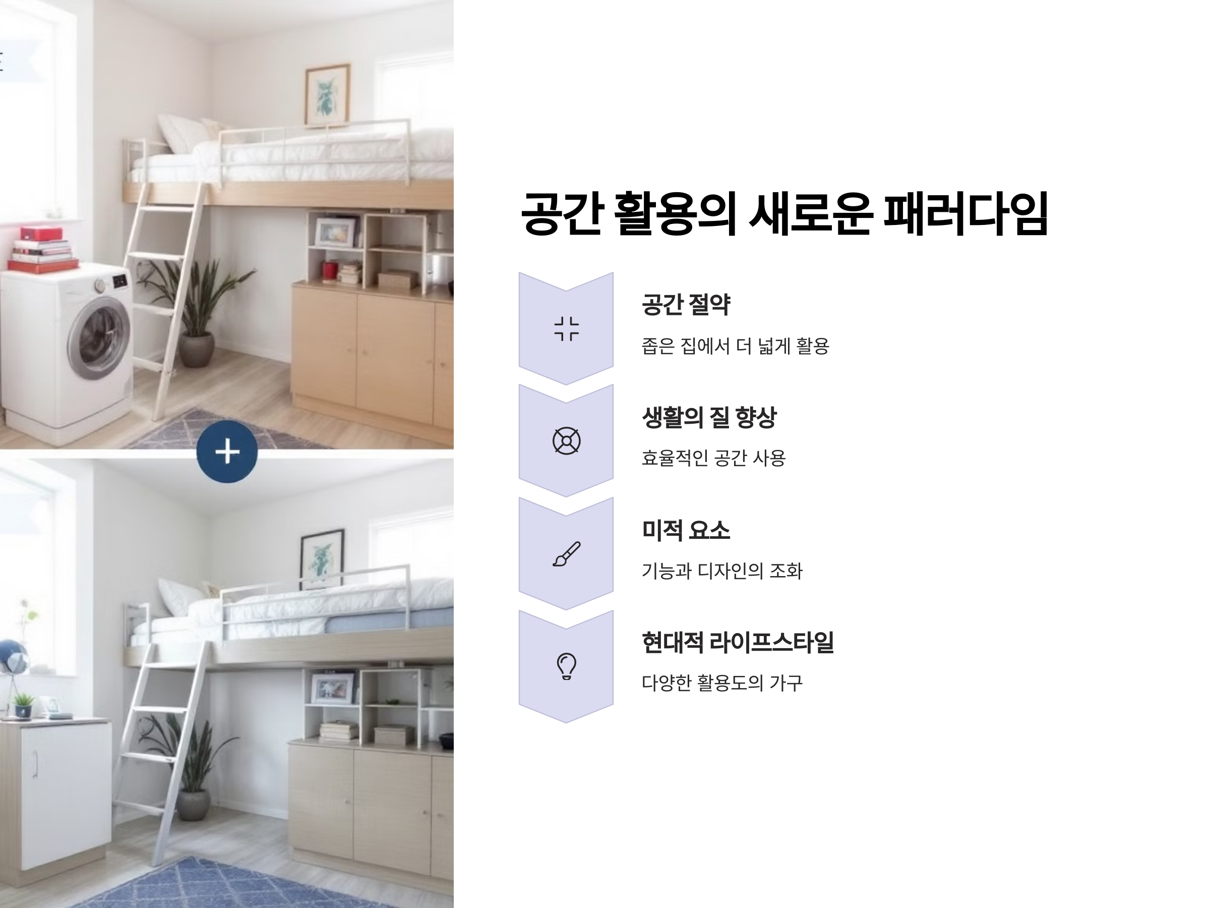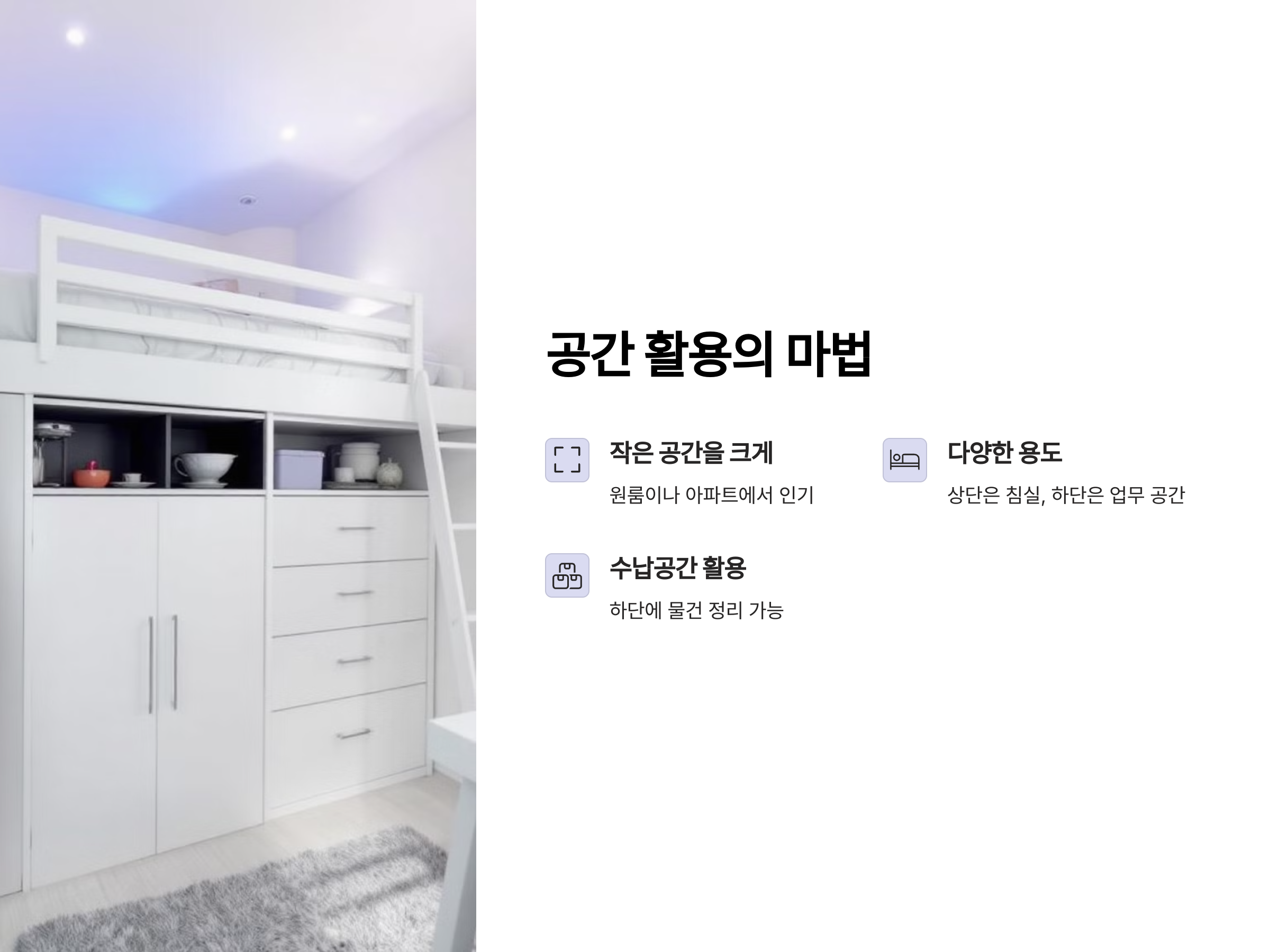2층침대는 기본적으로 작은 공간을 크게 만들어주는 마법 같은 효과를 줍니다. 특히 작은 원룸이나 아파트에서 많은 인기를 끌고 있습니다. 침대의 상단과 하단을 각각 다른 용도로 활용하면, 공간의 효율성을 높일 수 있습니다. 예를 들어, 상단은 아늑한 침실로 꾸미고 하단은 책상과 의자를 배치하여 공부나 업무 공간으로 활용할 수 있습니다.