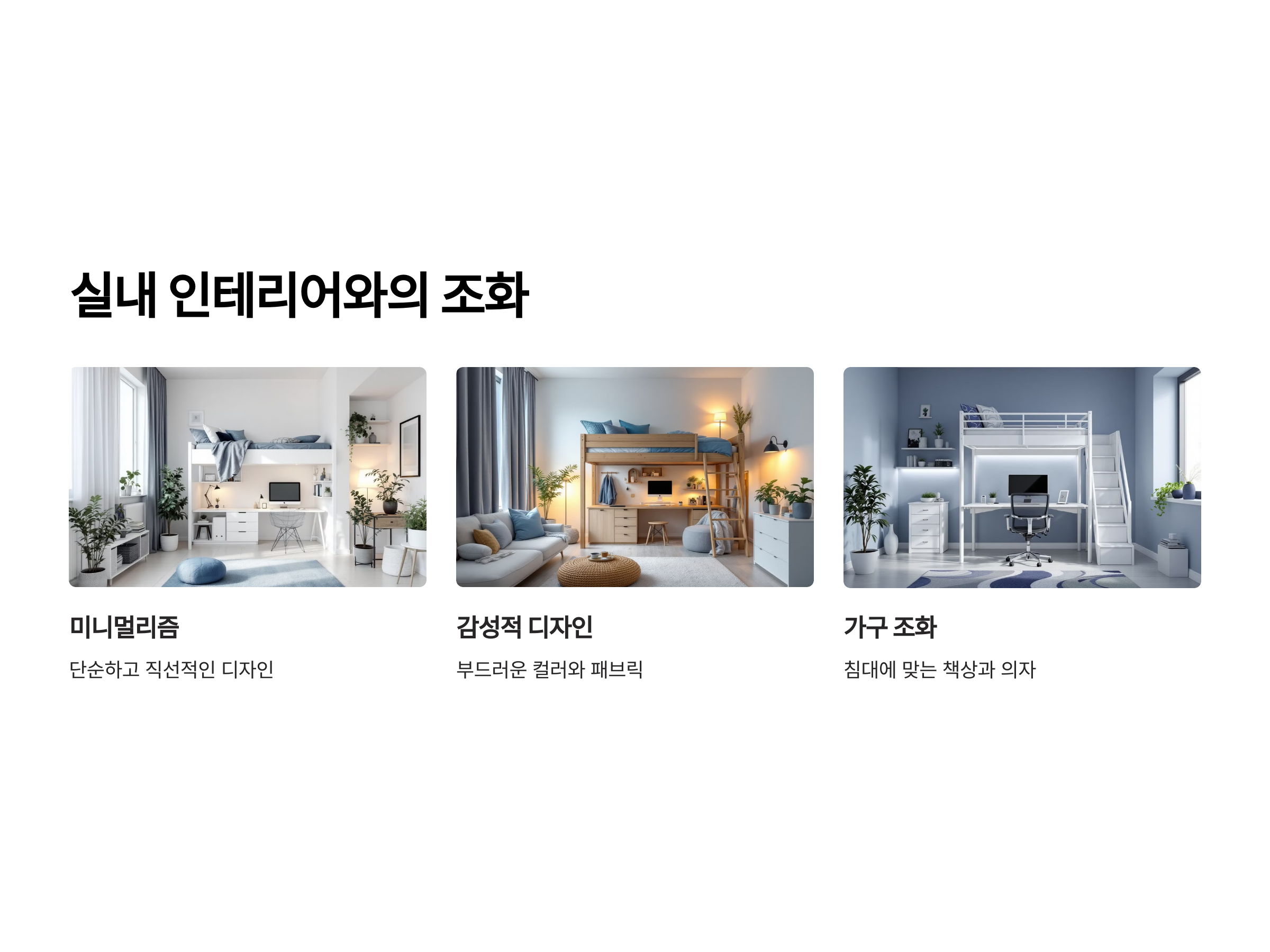 2층침대 인테리어는 단순히 공간을 절약하는 것을 넘어, 생활의 질을 높이고 효율적으로 공간을 사용하는 데 중요한 역할을 합니다. 다양한 디자인과 기능을 갖춘 2층침대는 좁은 집에서 더욱 빛을 발하며, 현대적인 라이프스타일을 반영하는 요소로 자리잡고 있습니다.