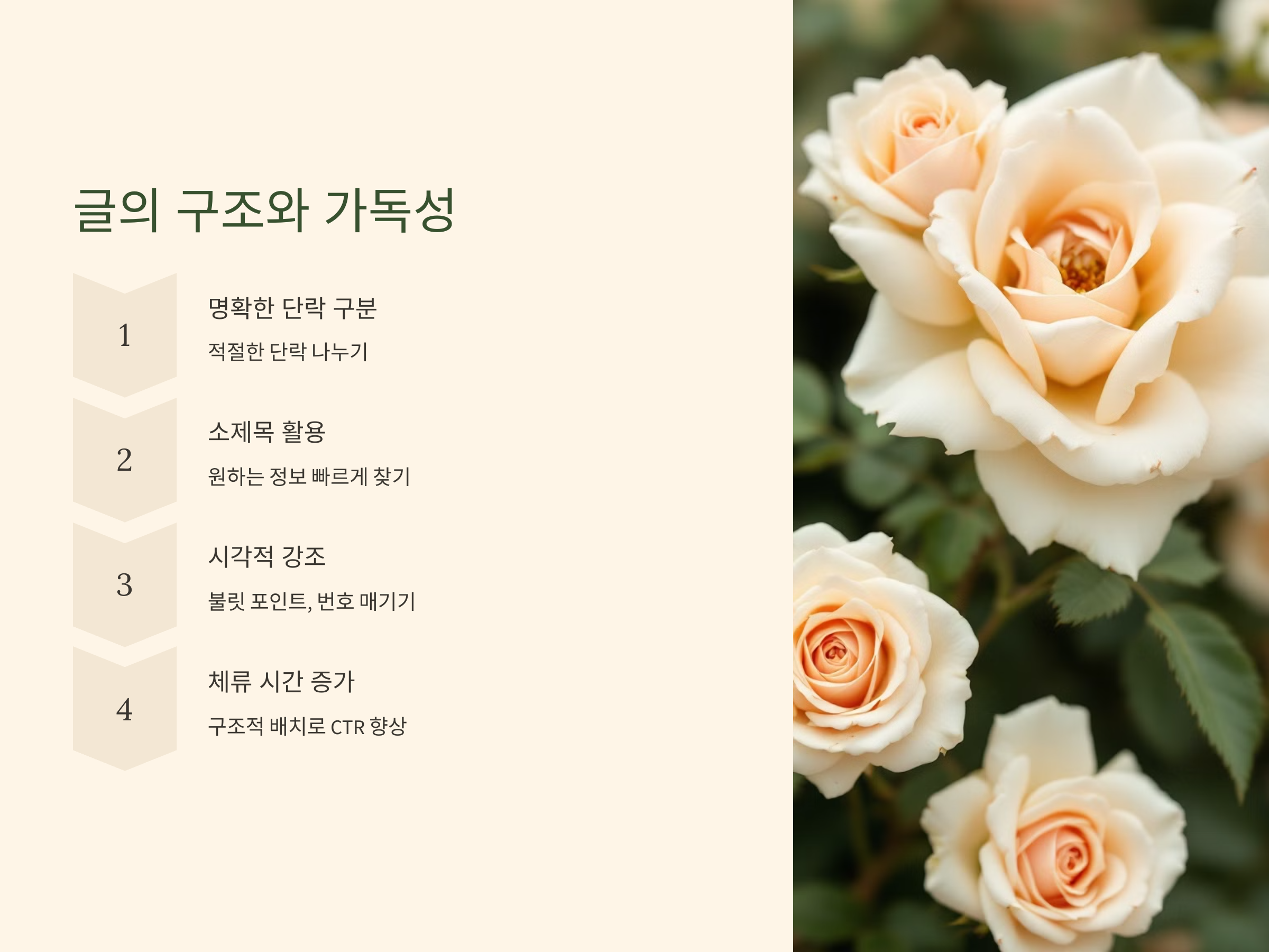 예를 들어, 긴 글을 작성할 때는 중간중간 소제목을 넣어 독자가 자신이 원하는 부분을 빠르게 찾을 수 있도록 도와야 합니다. 또한, 중요한 정보나 키 포인트는 불릿 포인트나 번호 매기기를 통해 시각적으로 강조할 수 있습니다. 이와 같은 구조적 배치는 독자가 글을 더 오래 읽게 만들고, 체류 시간(CTR)을 높이는 데 큰 도움이 됩니다.