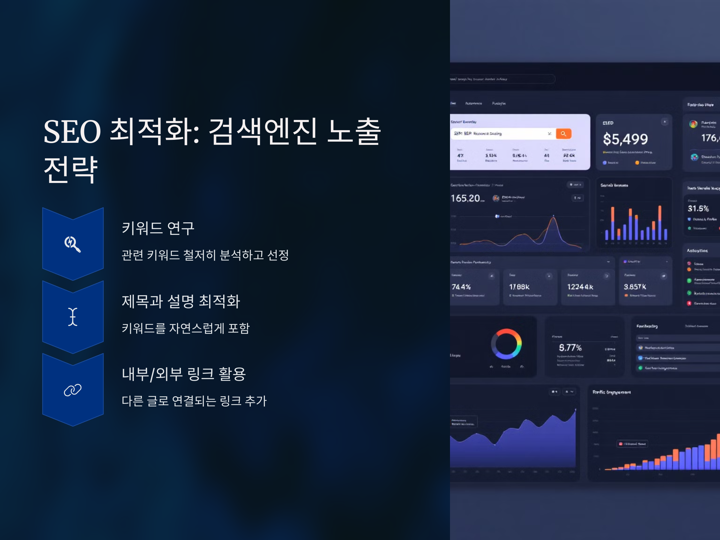 - 제목과 설명 최적화: 제목은 검색 결과에서 가장 먼저 보이는 부분이므로, 키워드를 자연스럽게 포함하는 것이 좋습니다. 또한, 글의 설명(메타디스크립션)을 작성할 때도 키워드를 넣어 검색엔진이 쉽게 인식할 수 있도록 해야 합니다.