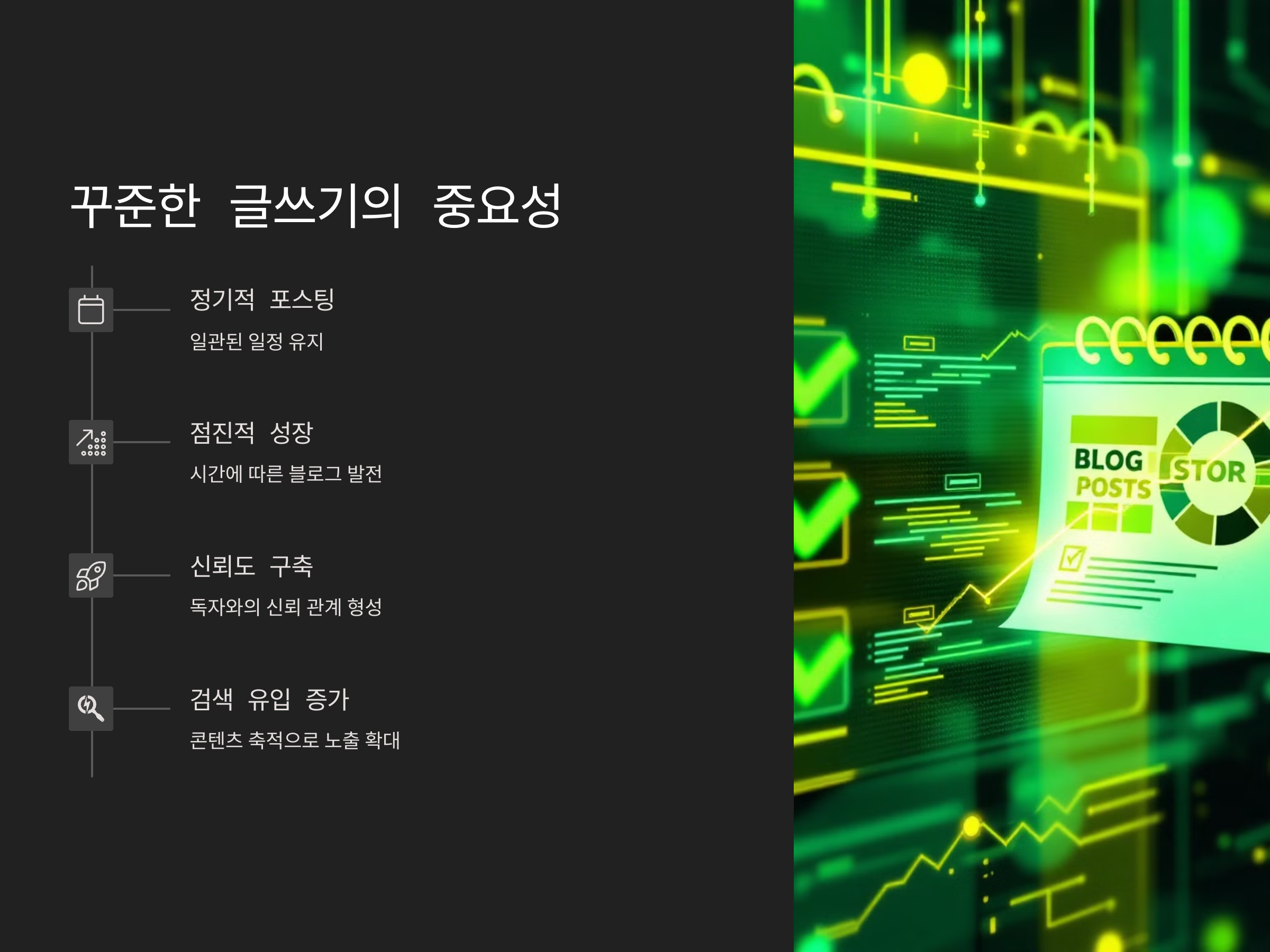 꾸준히 글을 작성하면, 자연스럽게 검색엔진에서 더 많은 유입이 발생하고, 블로그가 성장할 수 있습니다. 또한, 독자들은 일관성 있는 블로거에게 더 많은 신뢰를 갖게 됩니다.