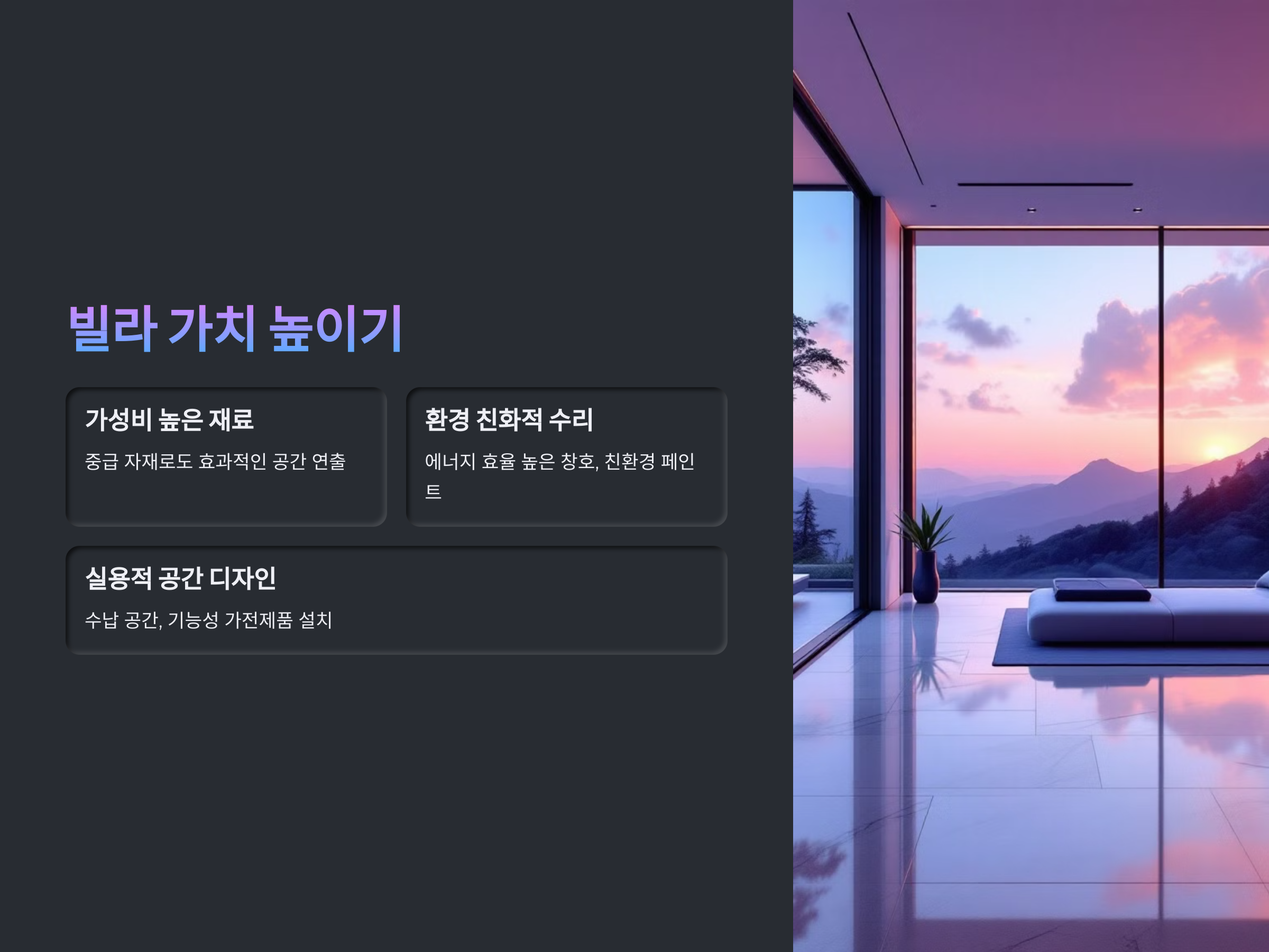환경을 고려한 수리 방법도 빌라 가치를 높이는 중요한 요소입니다. 에너지 효율을 높이는 창호 교체, 태양광 시스템 설치, 친환경 페인트 사용 등은 집의 가치를 높일 수 있으며, 향후 유지비용을 절감할 수 있습니다.