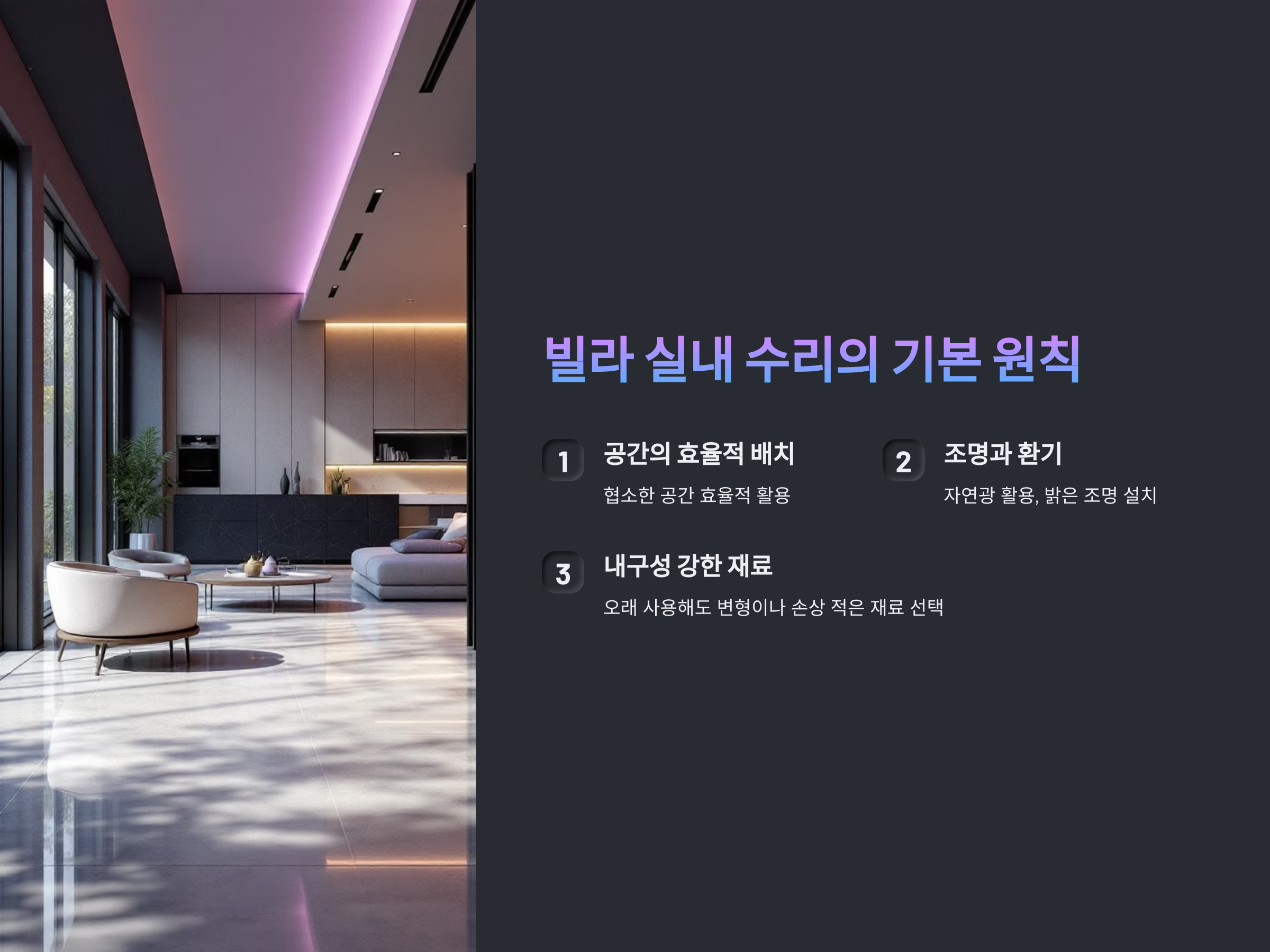 빌라 실내 수리에는 몇 가지 중요한 원칙들이 있습니다. 제대로 된 계획을 세우고 필요한 부분을 우선적으로 개선하는 것이 핵심입니다.