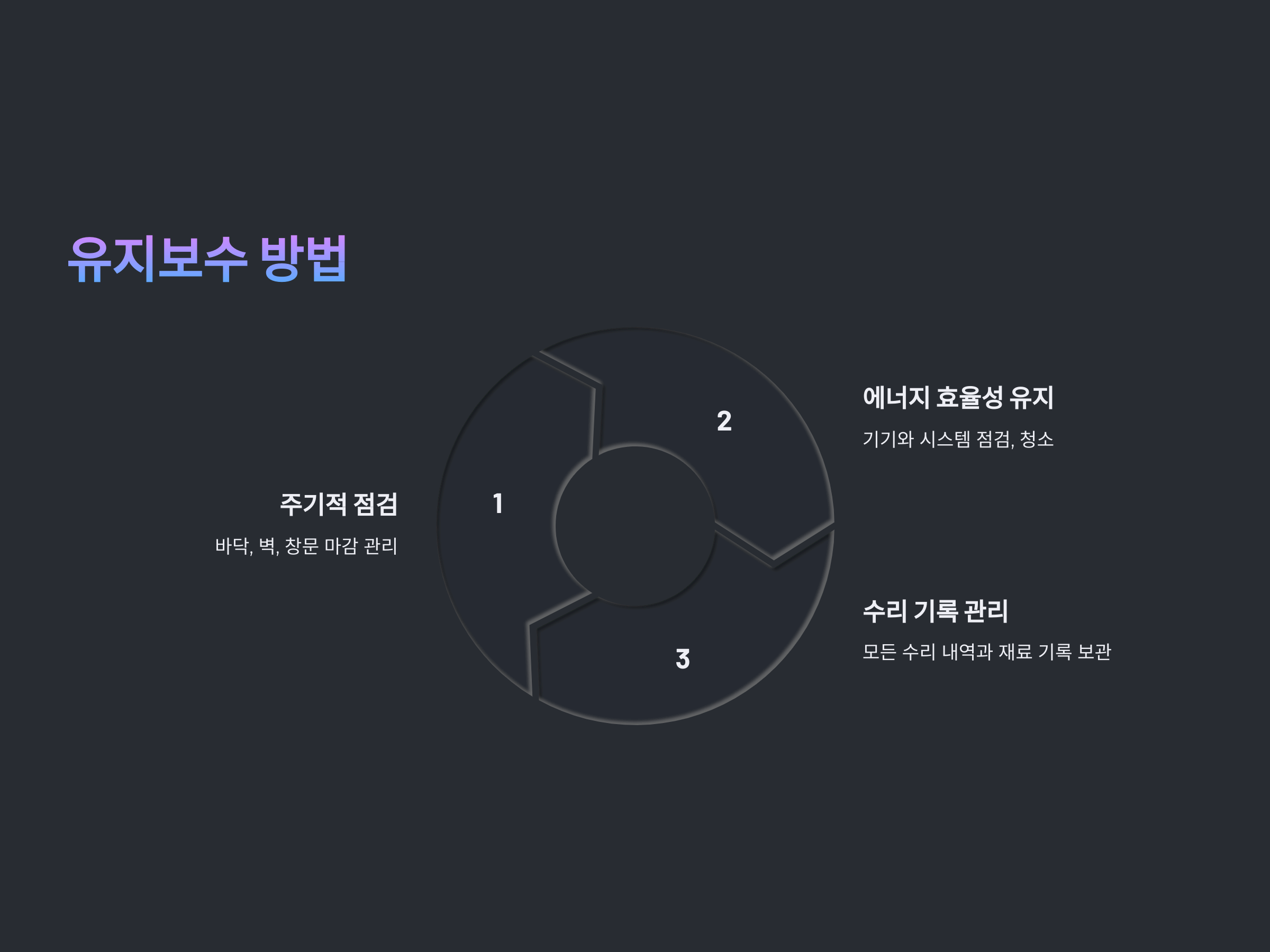 리모델링을 통해 에너지 효율이 좋아졌다면, 그 상태를 지속적으로 유지하기 위해 기기와 시스템을 점검하고 청소해야 합니다. 예를 들어, 에어컨과 히터의 필터를 자주 청소하거나, 창문의 기밀 상태를 점검하는 것이 중요합니다.