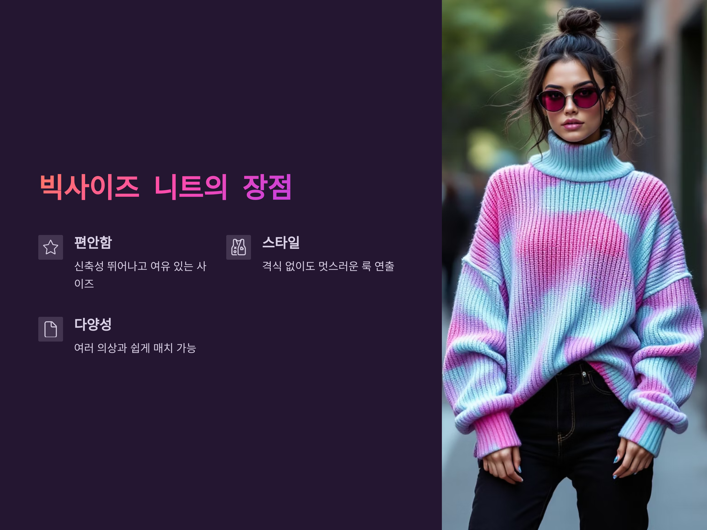 빅사이즈 니트는 스타일과 편안함을 모두 만족시킬 수 있는 아이템입니다. 소재, 핏, 디자인을 신중하게 선택하여 나만의 스타일을 완성하세요. 다양한 코디법과 계절별 스타일링을 활용하면 어떤 상황에서도 빅사이즈 니트를 멋지게 소화할 수 있습니다. 특히, 니트의 여유로운 핏 덕분에 몸매를 커버하면서도 세련된 느낌을 줄 수 있다는 점이 큰 매력입니다.