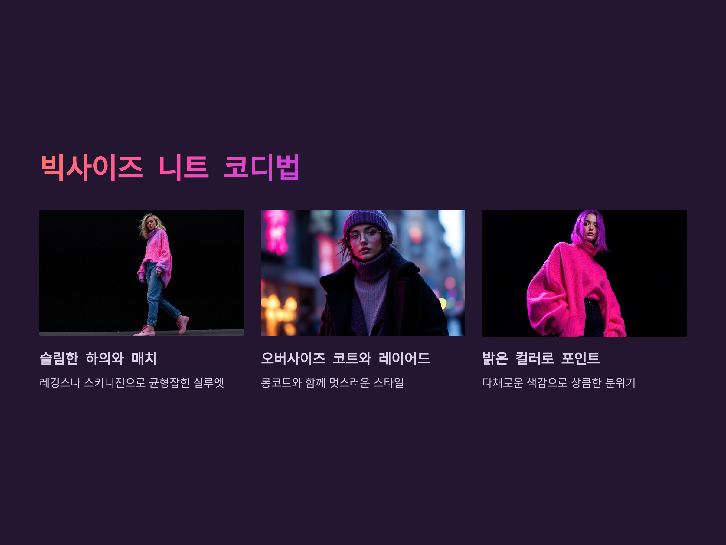 - 오버사이즈 코트와 레이어드 – 빅사이즈 니트는 오버사이즈 코트와 함께 레이어드하여 더욱 따뜻하고 스타일리시한 룩을 만들 수 있습니다. 특히 겨울철에는 롱코트와 함께 입으면 멋스러우면서도 실용적인 스타일을 완성할 수 있습니다.