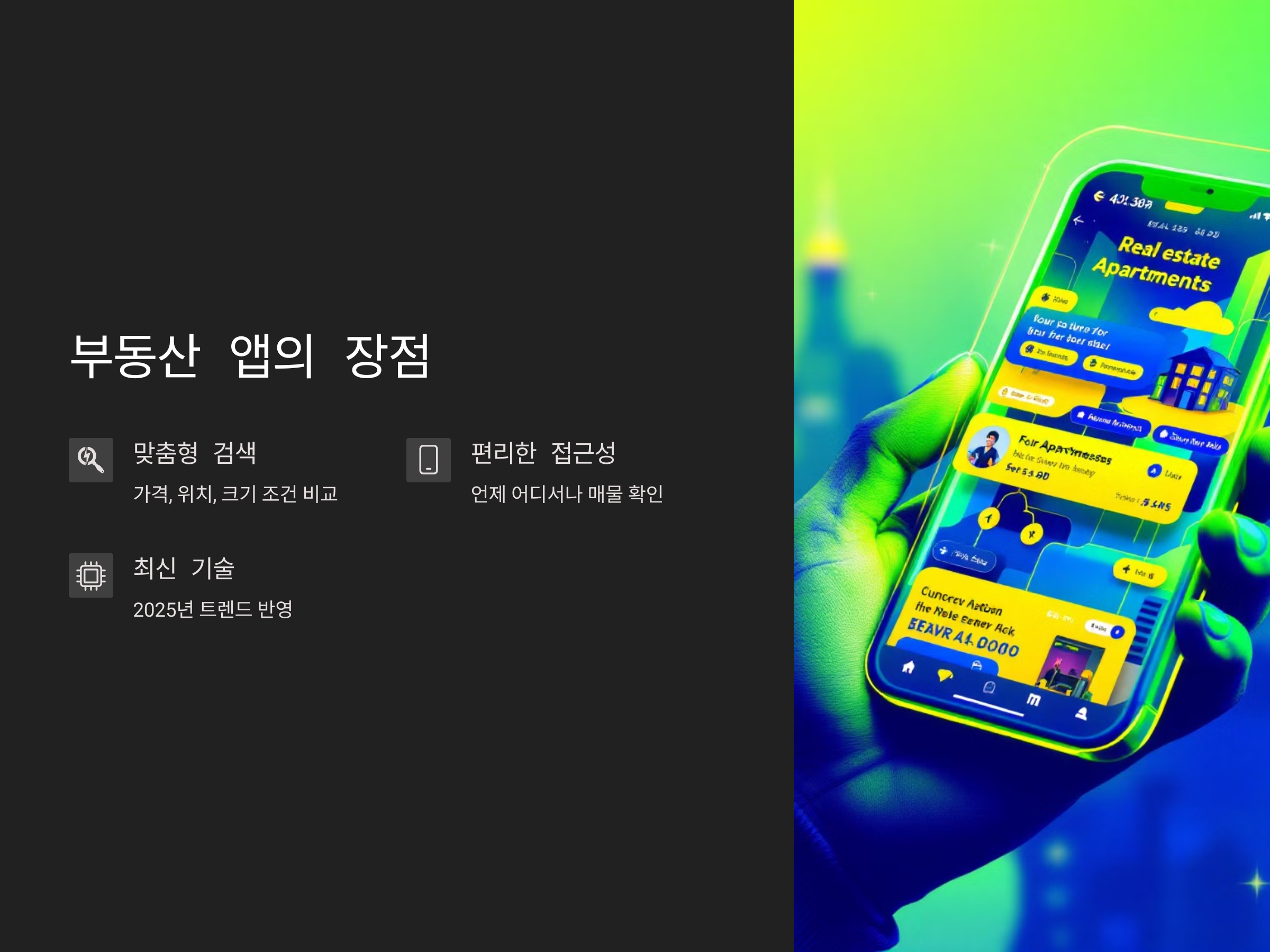 각각의 앱은 사용자가 원하는 조건에 맞는 원룸을 쉽게 찾을 수 있도록 다양한 기능을 제공하고 있습니다. 가격, 위치, 크기 등 여러 조건을 비교할 수 있으며, 최신 트렌드를 반영한 기술이 적용되어 더욱 편리해졌습니다. 이제 2025년 최신 부동산 앱들을 소개하고, 어떤 앱이 여러분에게 가장 적합한지 살펴보겠습니다.