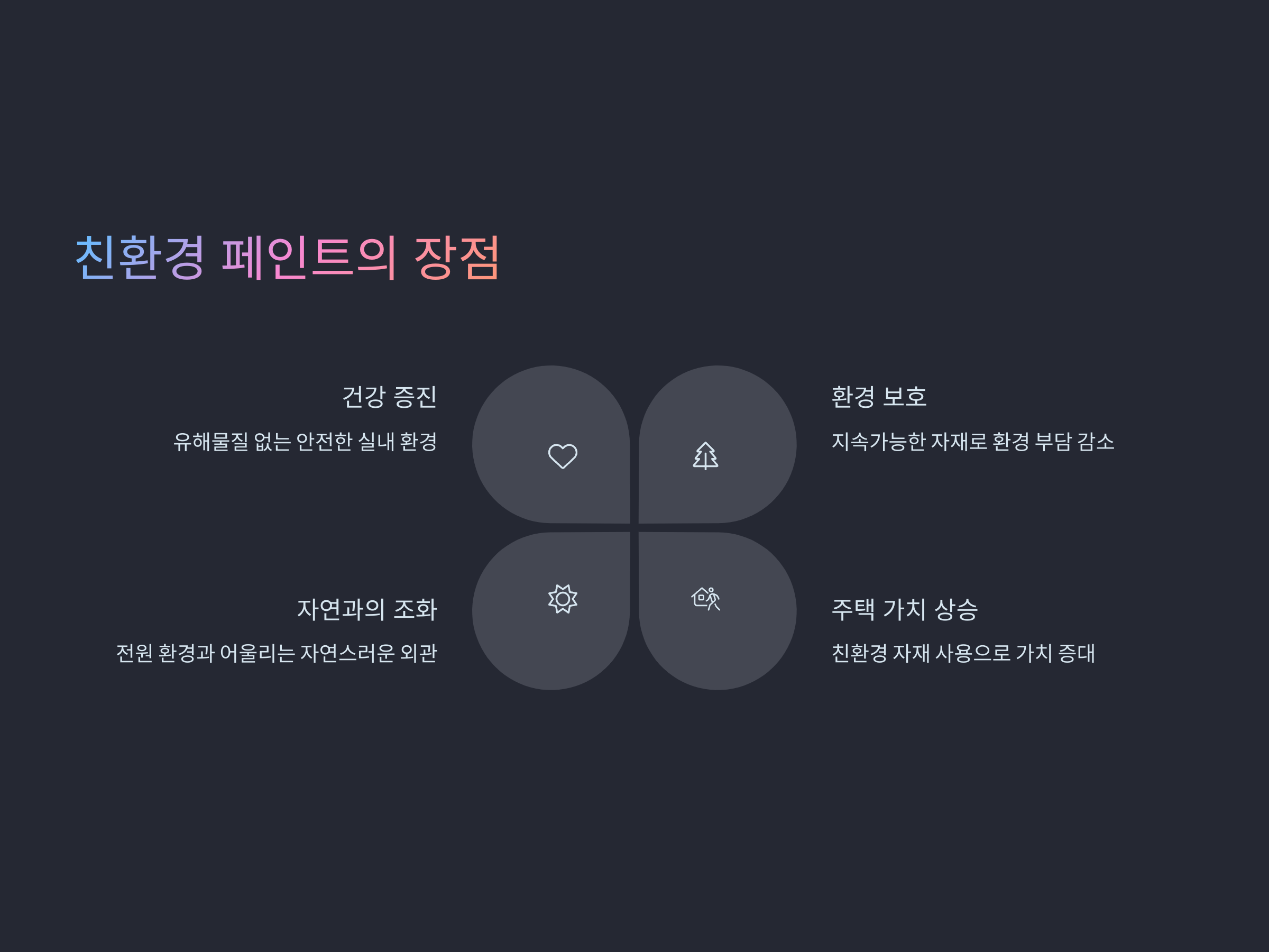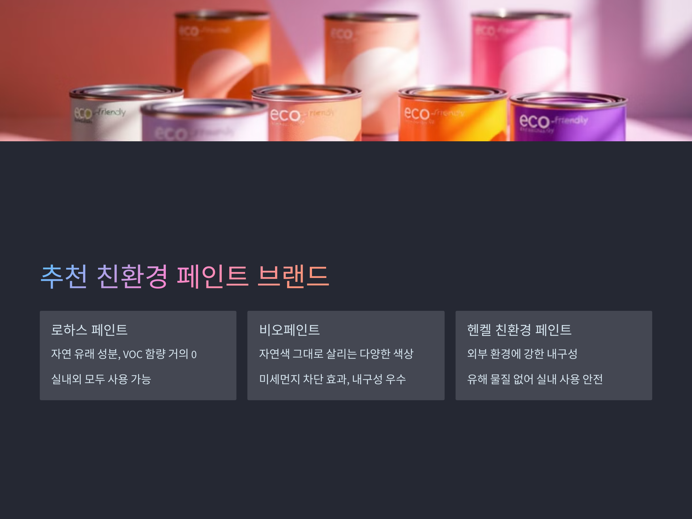 친환경 페인트는 화학 성분을 최소화하여 환경과 사람에게 안전한 제품입니다. 일반 페인트에는 종종 독성 물질이나 휘발성 유기 화합물이 포함되어 있습니다. 이러한 성분들은 실내 공기질을 악화시키고, 장기적으로 건강에 해로울 수 있습니다. 반면, 친환경 페인트는 이런 위험을 줄이고, 지속 가능한 재료로 만들어져 환경을 보호하는 동시에 집 안의 공기를 깨끗하게 유지할 수 있습니다.